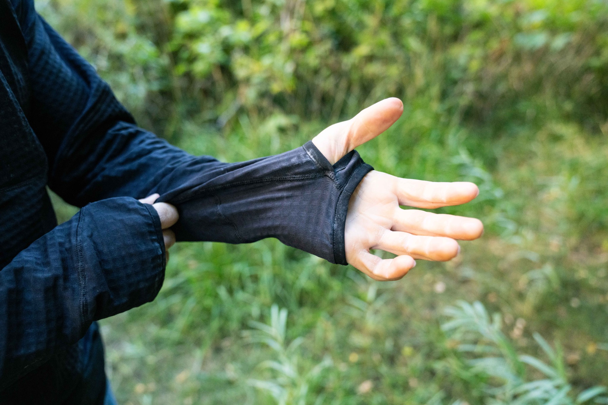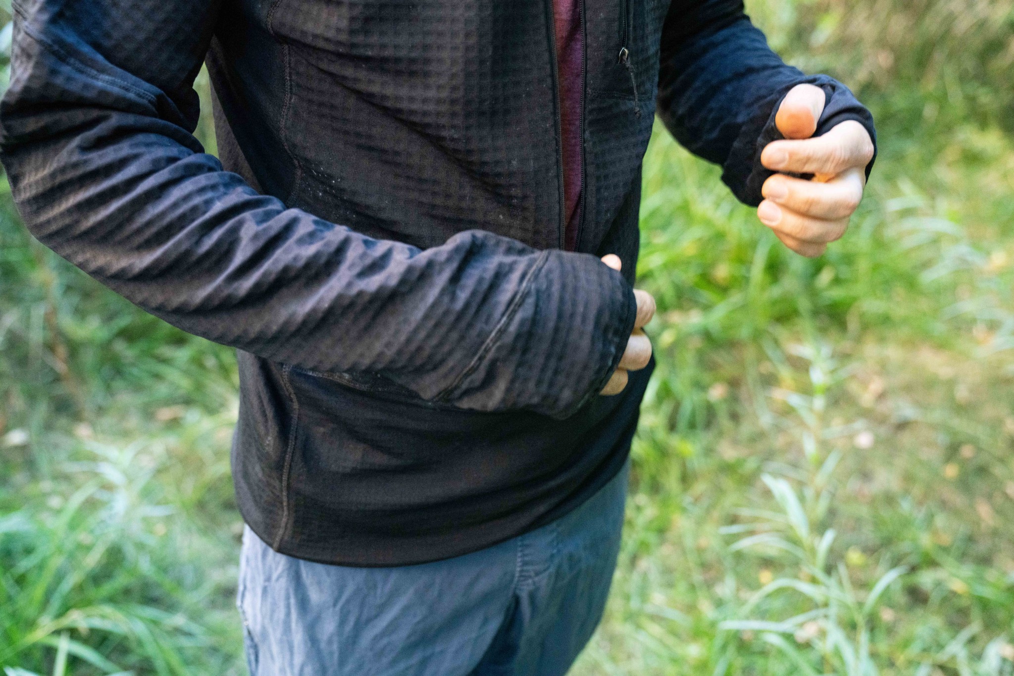 Despite the R1's inability to function well when stationary, it has a snug fit and the balaclava-style hood helped protect our testers' ears and faces. The thumb holes keep the sleeves down when needed and the slight elasticity allows the sleeves to be pushed up and stay up while active. The athletic cut kept the fleece close to the body, trapping heat, and allowed for ideal layering under a rain jacket. While its thinness works against it, the versatility of the R1 makes it work well in terms of warmth, especially as a mid-layer piece.