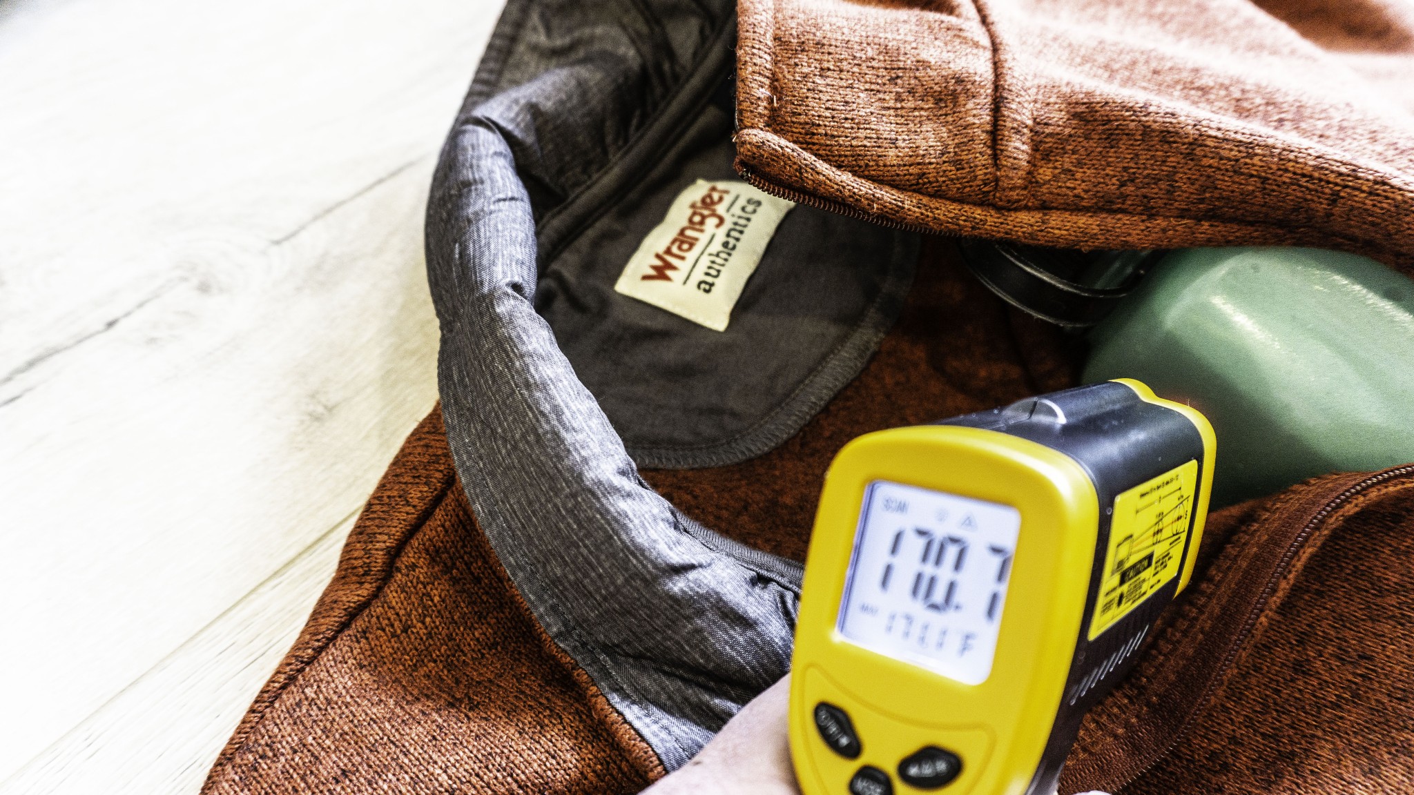 The Wrangler Authentics kept the bottle above 150°F for one hour and five minutes. This isn't the best score, but it surprisingly offered decent wind protection, collectively maintaining enough warmth for many uses, especially in more temperate climates or in urban settings. Other options in our review, during the bottle test, lasted over 20 minutes longer, so we'd look elsewhere if you need the warmest fleece. When considering most people will use an over jacket of some kind, the Wrangler Authentics is certainly adequate for budget shoppers.