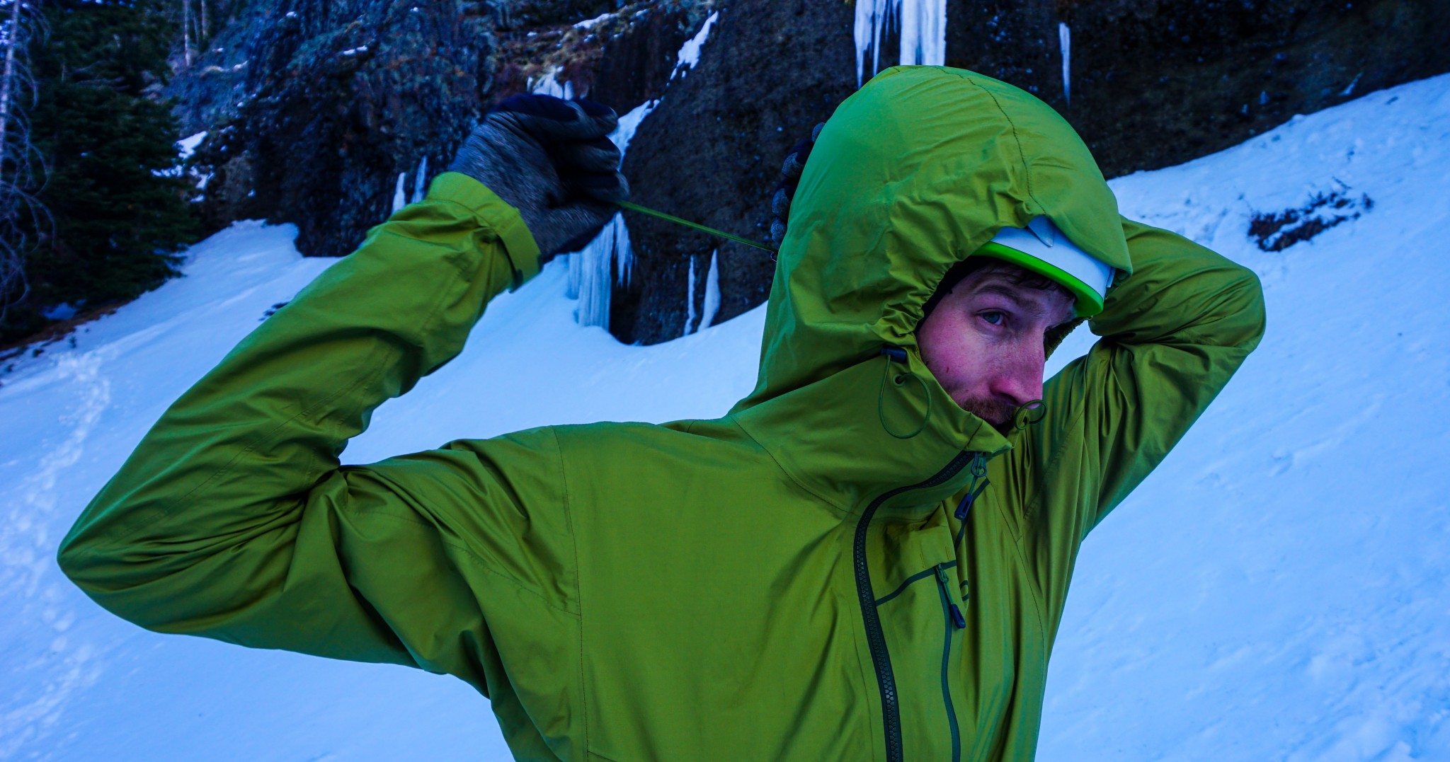 When it comes to mobility, the Interstellar is close to perfect. In direct contrast to any jacket that uses a Gore-Tex Pro membrane, such as the Arc'teryx Alpha FL, this jacket is supple and quiet, without any crinkly noise when you move. The fabric is soft and stretchy, providing zero resistance when ice climbing or skiing, which allows the fit to more athletic without compromising movement. There is a moderate rise in the hem with arms overhead, but not enough for it to untuck from a harness.