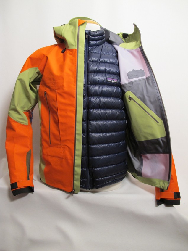 MaterialsThe Super Alpine is constructed with three-layer Gore-Tex Pro membrane, the most durable and warmest waterproof breathable technology we know of. All Pro jackets utilize the same membrane and micro grid backer, but the specific face fabric (outermost layer) can be customized. Here, the Super Alpine uses a 3.8 oz 40-denier Gore-Tex Pro Shell (green in our test model) with 4.9-oz 150-denier Pro Shell reinforcements (orange). These fabrics, and the jacket's pattern, are excellent. The lighter material is used on the back, underarms, and neck, while the front, shoulders and hood are reinforced. As a result, the Super Alpine is 3.3 oz heavier than the Super Pluma. (Patagonia lists the Super Alpine as being 18.5 oz., but our scale measured it as 17.4 oz.) The Super Alpine increased durability makes it better suited to trips of longer duration and activities that demand a very strong and abrasion resistant jacket.