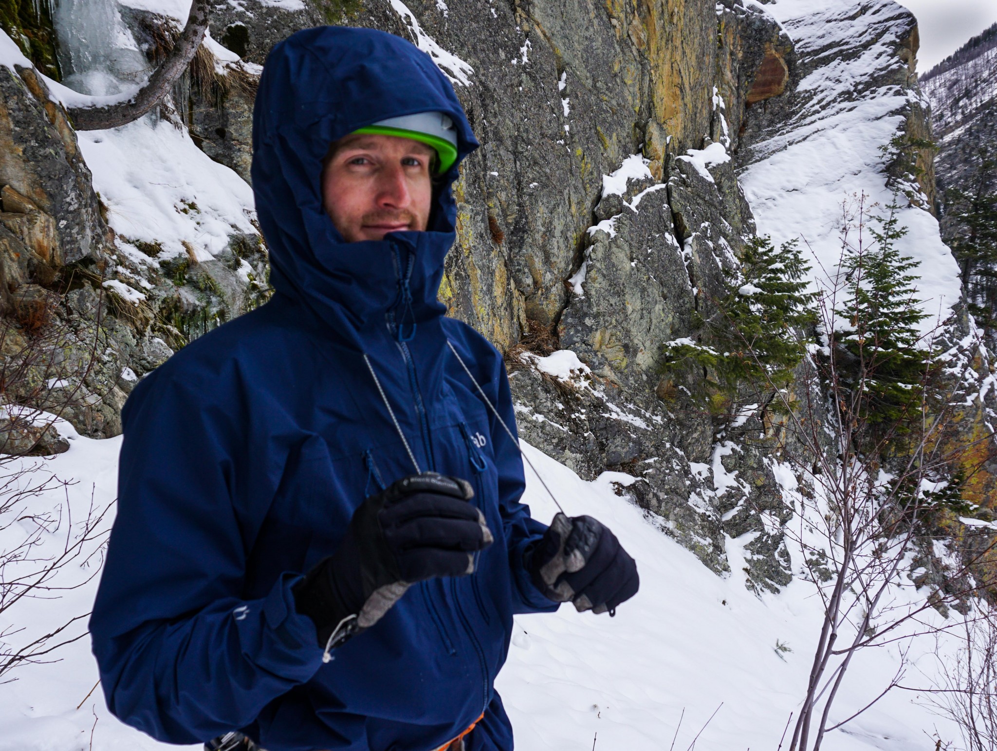 The Rab Latok is made with the same waterproof Gore-Tex Pro membrane that you find on many of the other top-scoring jackets for weather protection. The Latok, however, suffers from a few design issues that prevent it from being a top-scorer. First is the hood, which has a brim that wasn't quite stiff enough to keep water out of the jacket when our tester wasn't wearing a helmet during our shower test.