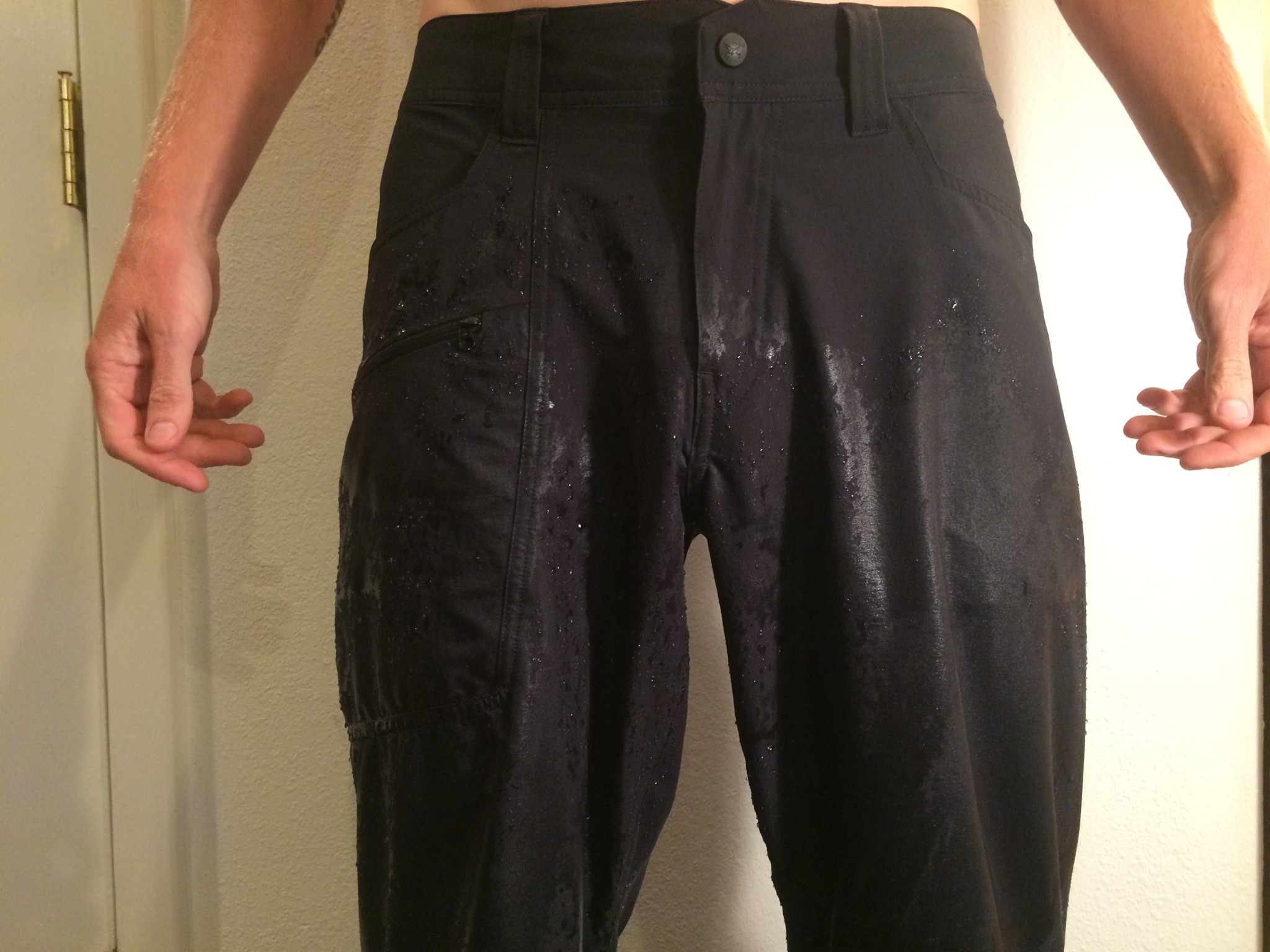 We were delighted with the performance of these pants. Water beaded up and ran off without soaking in, especially in lower wear areas like the lower legs. On the thighs, after probably a full minute of intense dousing, water eventually began to soak into the nylon fabric but never made its way all the way through, as happened with The North Face Paramount 3.0.