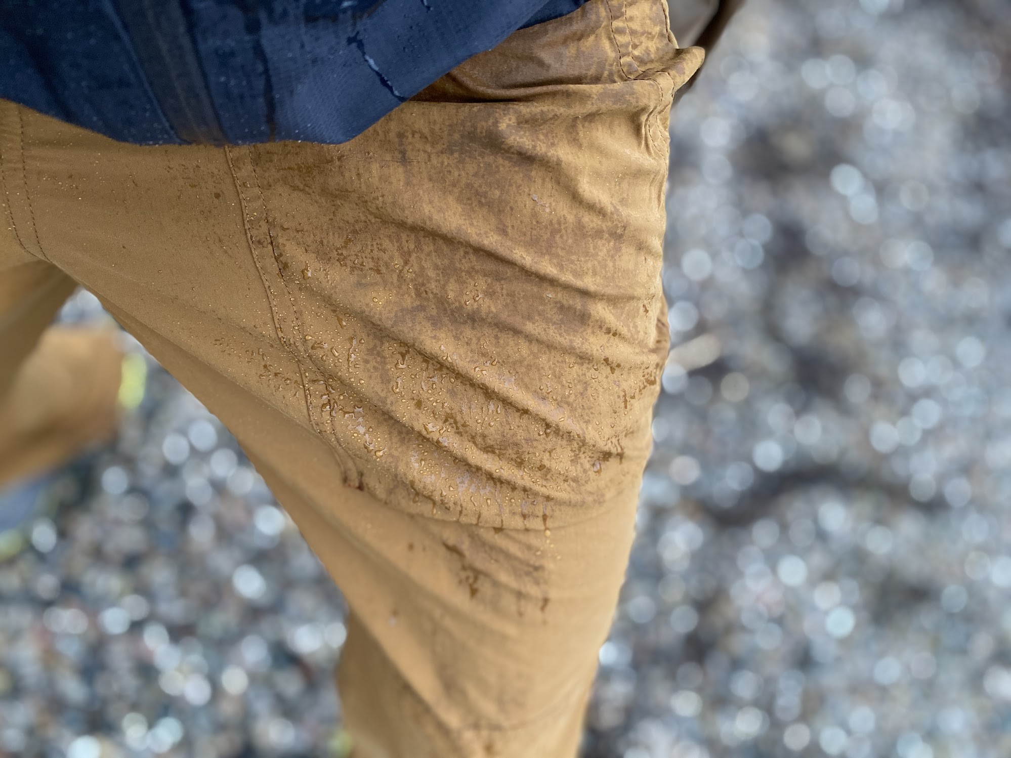 These pants do a decent job out in the elements, but they wouldn't be our first choice. They come treated with a DWR coating that beads mist and repels lighter rain. However, if you find yourself in a moderate storm for any amount of time, you will start to notice the fabric wetting through. We suspect that the DWR coating is sufficient, but the fabric is just a little less densely woven than other models.