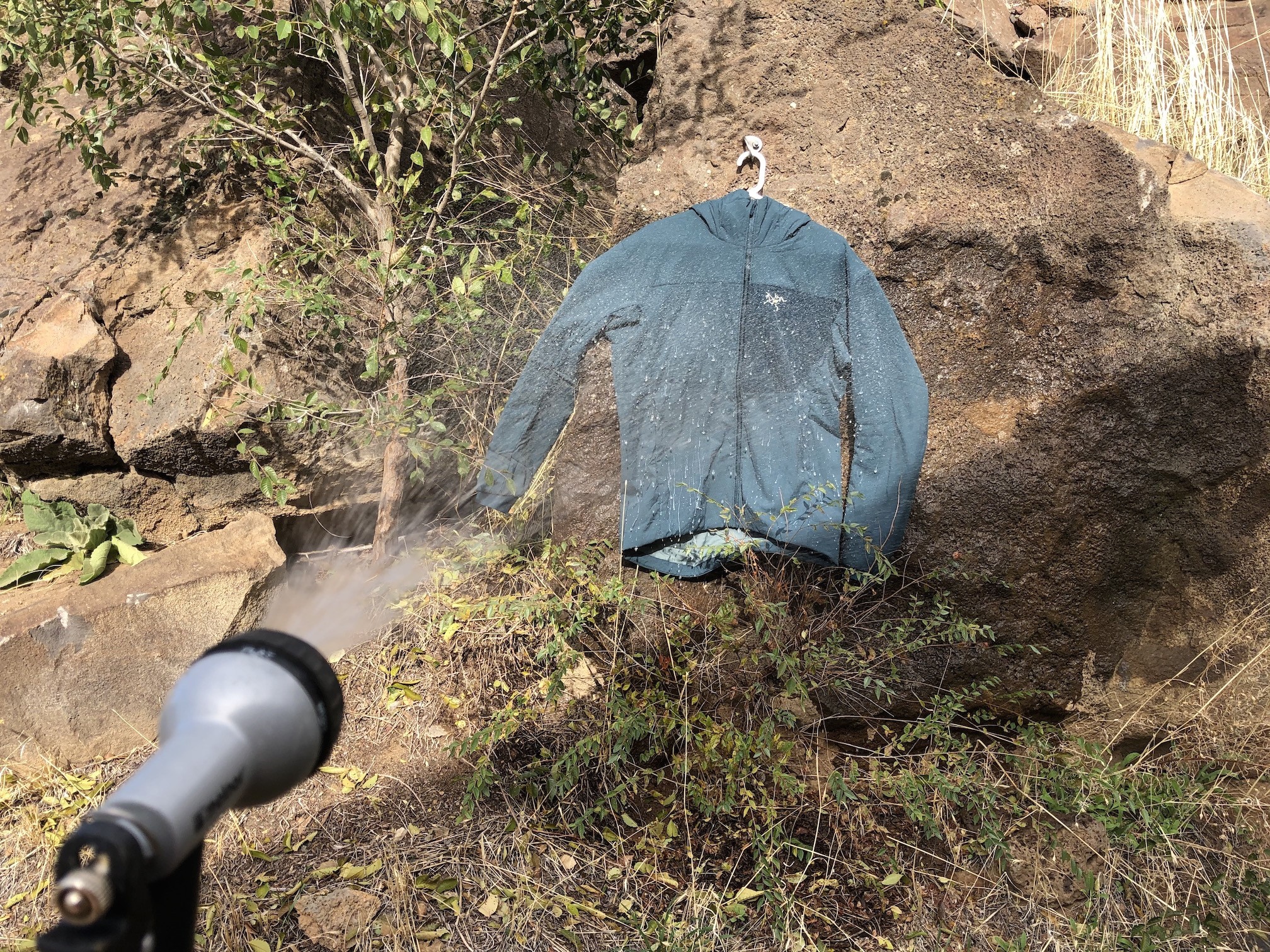 What really impressed us, however, is the performance of the DWR coating. We sprayed it with a hose for over a minute to see how it would hold up, forcing way more water at a higher velocity than would be encountered in even the stiffest downpours, and the water simply beaded up and ran off, with minimal absorption of any sort.