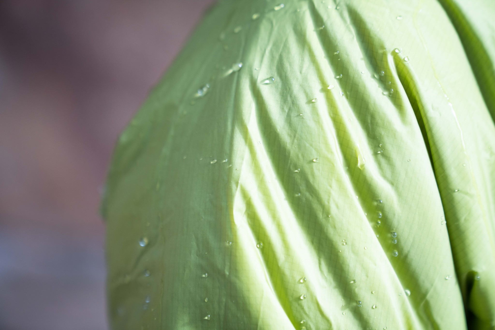 The Mountain Hardwear Compressor Hoody uses a 15D coated nylon ripstop outer fabric with DWR coating, which works well in light precipitation. We tested the jacket's weather resistance by spraying it with a hose and then again by pouring water on it. The DWR allowed the water to bead up and slide right off.