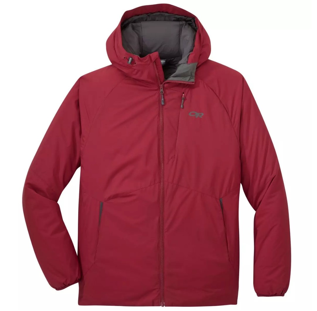 This jacket uses OR's VerticalX insulation, which is layered in sheets that don't need to be baffled and is arranged vertically to allow moist air to escape easier ("breathe"). It has two zippered hand pockets and another zippered chest pocket, while also sporting a helmet compatible hood that can be tightened via three separate drawcords. This jacket works best as a belay jacket on cold winter ice climbing or ski missions, as a stand alone jacket on spring or fall days when climbing in the shade or hanging outdoors in the mornings or evenings, or as an around-town piece all winter long.
