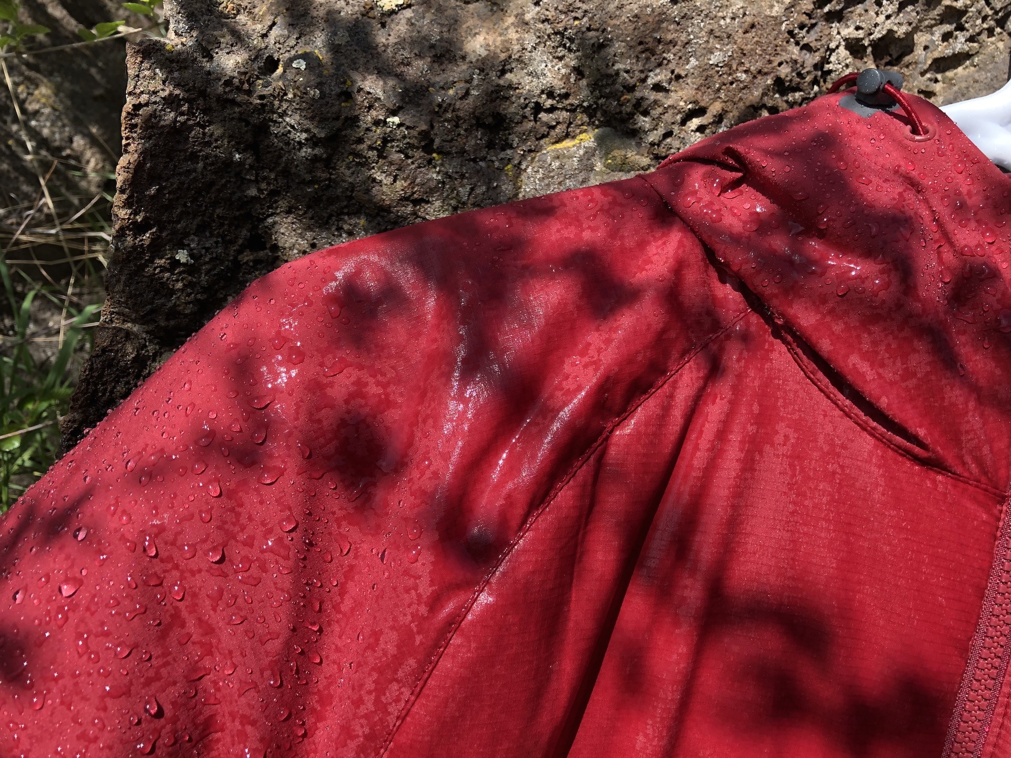 When it comes to water resistance, no insulating layer is designed to be as resistant as a shell. This one comes with a Durable Water Resistant (DWR) coating applied to the face, as most do, that causes a light amount of water to bead up and drop off. When we tested it by spraying it with a hose after many months of use, the DWR coating on the front of the jacket had mostly worn off, and the fabric quickly wetted out and allowed water absorption. Left in the sun and breeze after this test, we found that it dried very quickly.