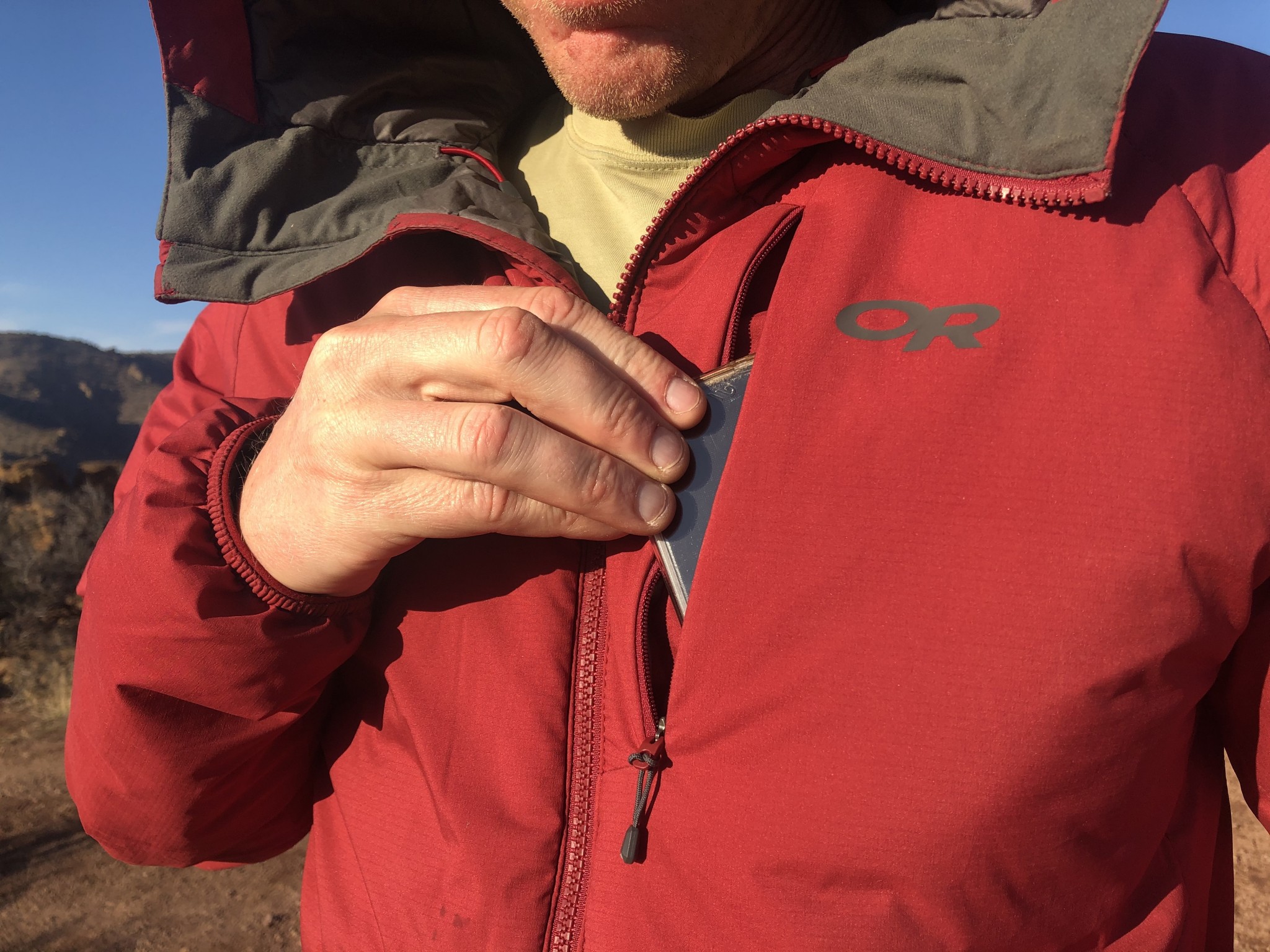 The Outdoor Research Refuge should not be confused with the OR Refuge Air, which is a much lighter active layer using many of the same materials. The Refuge is a beefy, burly insulated jacket that may incorporate all of the same breathable technologies found on the Air, but which is simply too warm for us to consider wearing when working out. We put this jacket on when we stop moving to trap the heat that our body is generating.