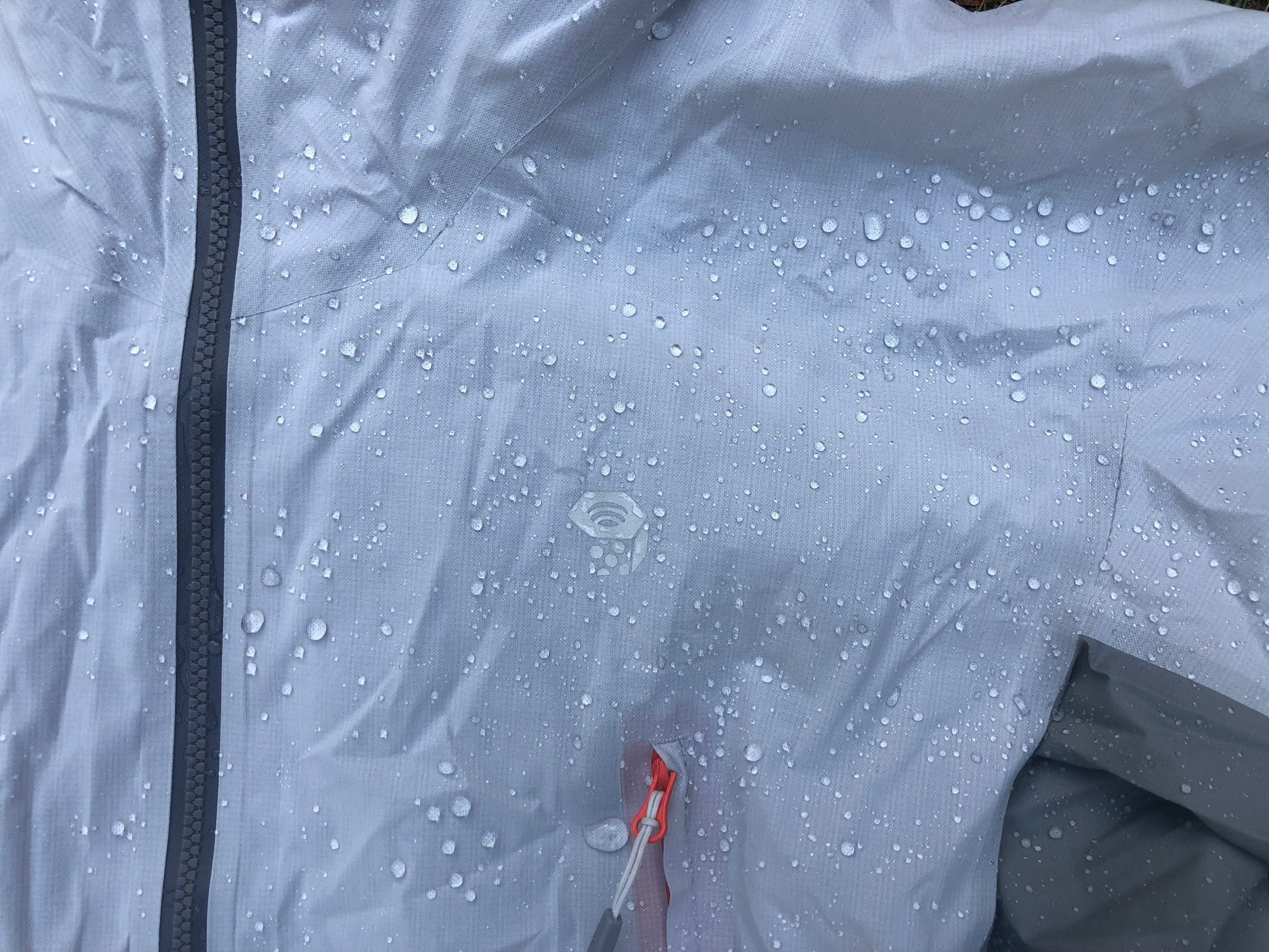 During our real-world testing and side-by-side lab comparisons, this jacket proved to be stormworthy. Its outer DWR was able to bead water longer than most of this model's direct competition could, and its hood, cuff, and front zipper design kept the rain out, taking considerably longer than other models to soak through.