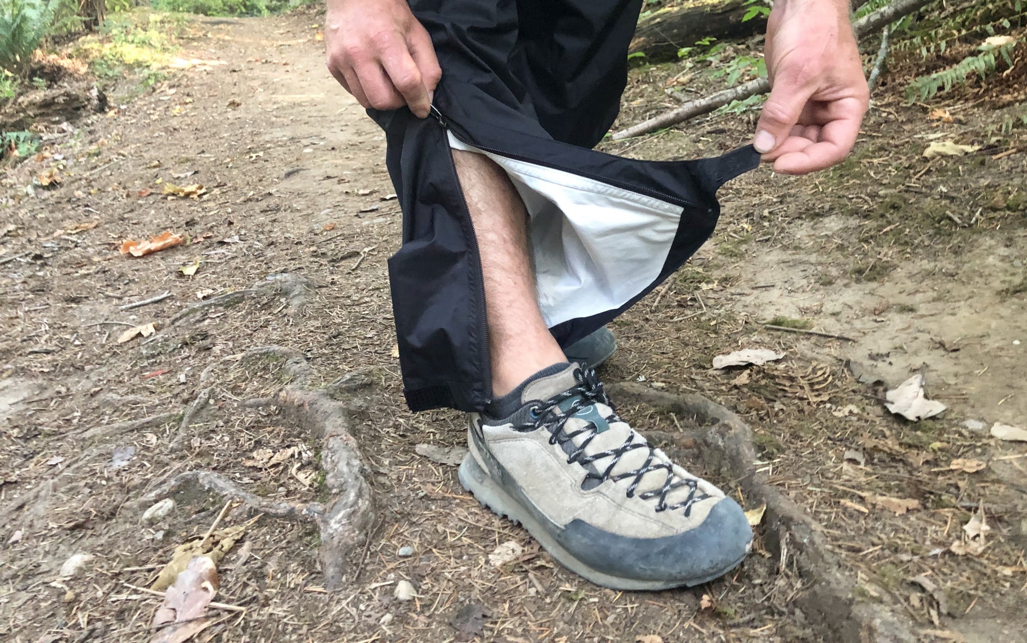 This pant, like its namesake implies, is bare-bones and just the essentials. It features a quarter-length zipper to helps pull the pant on without having to remove your shoes. Something we found easy with trail-runners, manageable with light hiking boots, and possible with limited pairs of mountaineering boots but it took some effort. This pant has no true front hand pockets, just a single side hip pocket that doubles as a stuff pocket. After extensive use, none of our testers found this to be a problem, instead noting that when wearing these pants, we nearly always had a rain jacket on, which had pockets that were generally more comfortable to utilize.