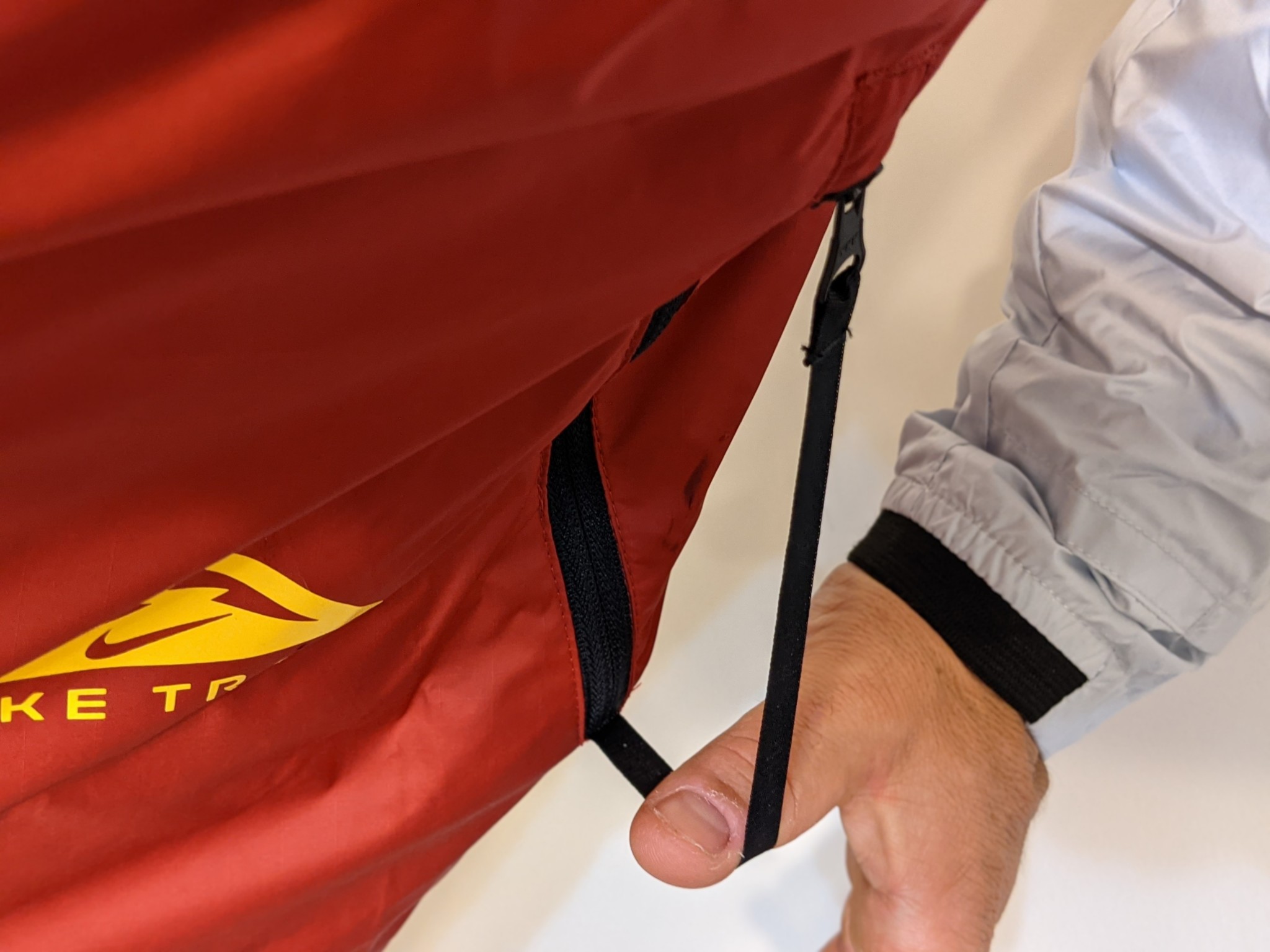 For every good feature the Windrunner brings to the table, the awkward design of that feature partially negates the benefit. This was the only jacket we tested with full-sized mittens built into the sleeve. Sadly, they're difficult to stow and tend to bunch up in their little pockets, causing discomfort and difficulty putting the jacket on. This was also the only jacket our testers had ever seen with pull cords on the zippered pockets that attach at the top and bottom of the pocket, making a loop you can grab and pull to open it. Sadly, if you can grab it, so can passing leaves and branches. Trailside foliage opened our pockets on test runs on at least two occasions. This was also the only jacket in our running jacket lineup with two front zippers, allowing it to be zipped from the top or bottom. But the zippers themselves are undersized and difficult to work with while moving, usually requiring several attempts to get lined up.