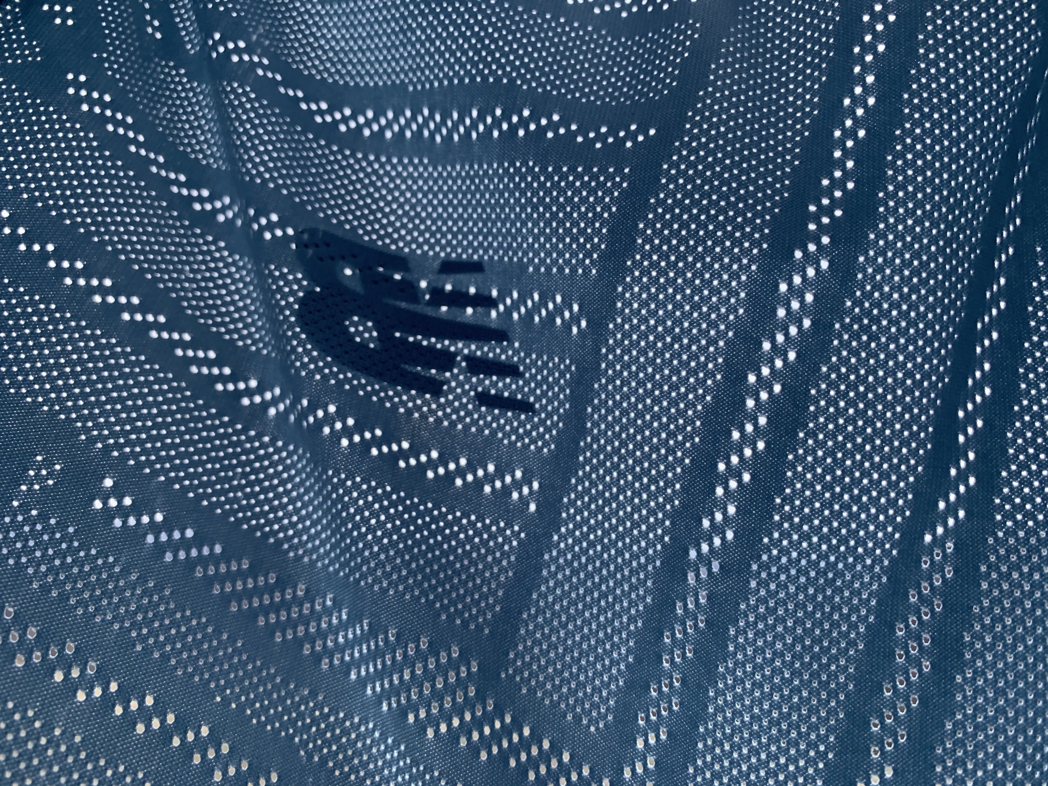 Let's take a close look at the material of the Q Speed. The 73% polyester 27% spandex fabric is more spandex than any other shirt we tested, resulting in a consistent four-way stretch that has great rebound and returns to its original shape. Jacquard means perforations, and the thousands of perforations on this shirt are positioned in an angular pattern. Some combination of the pattern, fabric, and stitching feels coarse and plastic-like, causing little points of discomfort on the insides of the upper arm and neck.