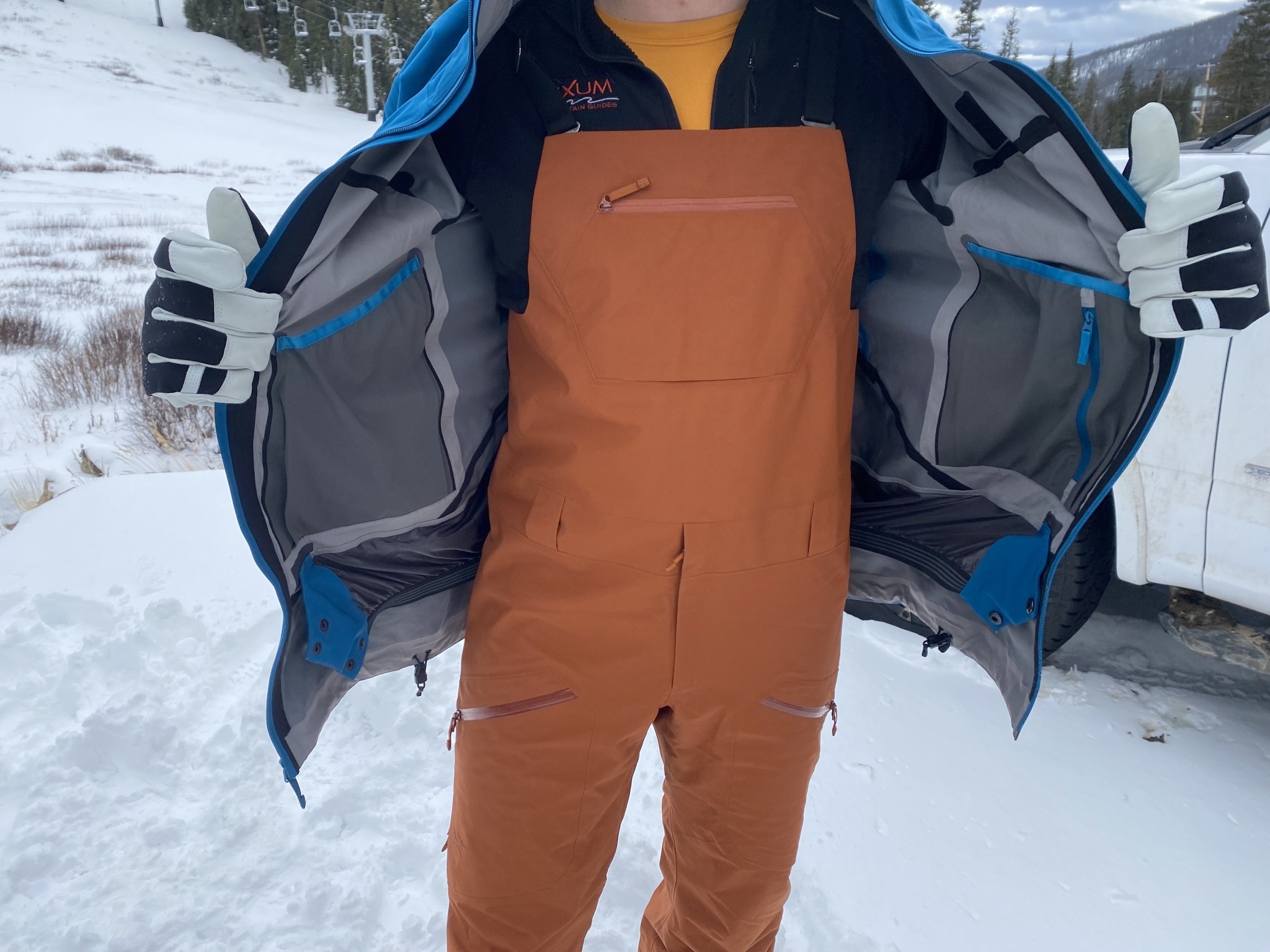 Even if it isn't storming on the ski hill, we still need places to stash our gloves, wallet, keys, snacks, and ski pass. The Procline doesn't skimp on useful features. It has two large external high hand pockets that aren't blocked by a backpack waist strap, as well as a roomy external chest pocket and a ski pass pocket on the left sleeve. On the inside, it has two mesh stash pockets for skins or goggles and one internal zippered mesh pocket that is useful for storing personal items like phones, credit cards, and keys. The jacket also comes with a powder skirt, though we don't reach for this jacket when it's dumping outside.