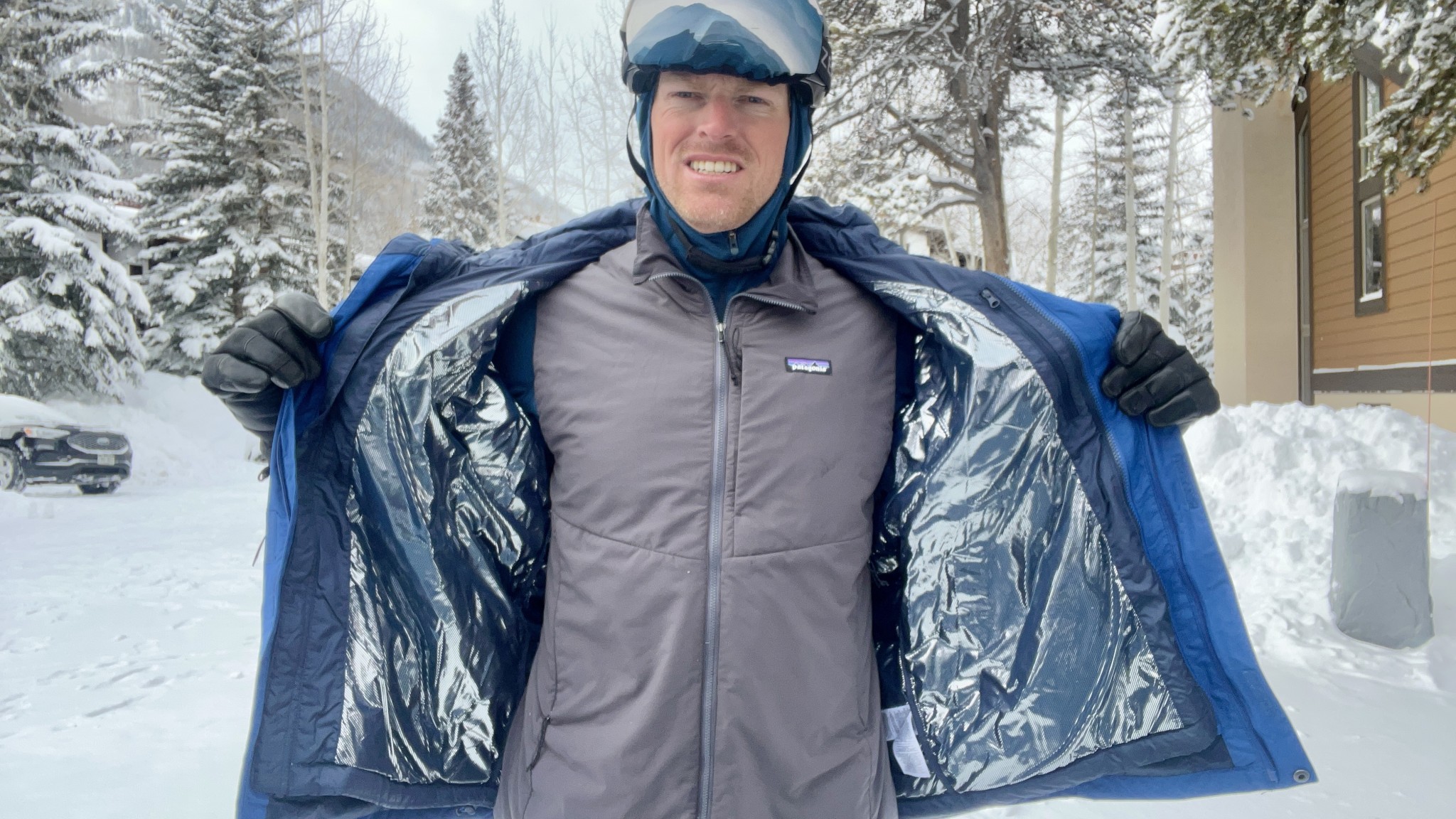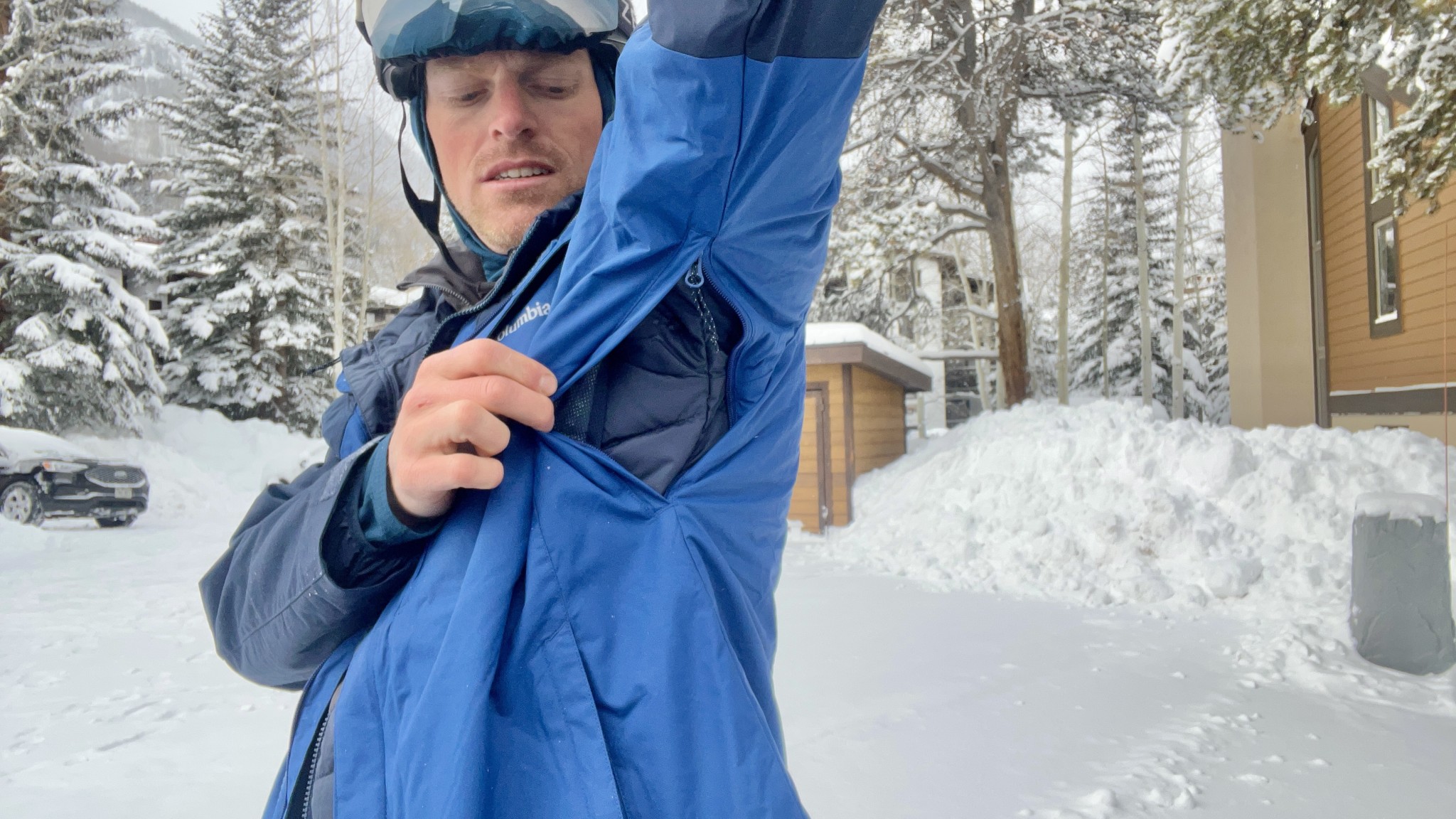 The Columbia Whirlibird V is a relatively warm ski jacket compared to other jackets we reviewed. It can't compete with the high-end down or synthetically insulated jackets, but it gets the job done with a burly outer shell jacket with a hanging mesh lining and a synthetically insulated inner sweater layer with an “Omni-Heat” thermal reflective material on the inside of the inner layer. Since this jacket combines multiple layers into one product, there is plenty of room for warm air to be trapped inside.