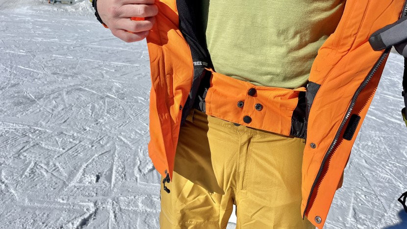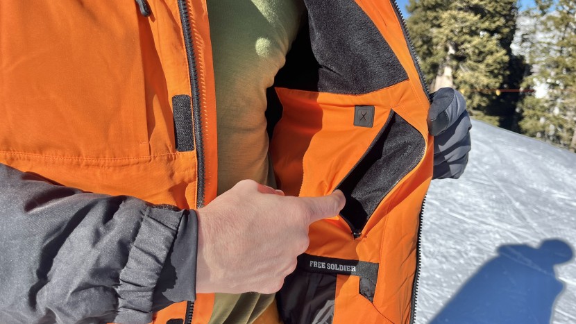 The Free Soldier ski jacket has many useful features that we'd only expect to find on more expensive jackets. There are two zippered chest pockets, two handwarmer pockets, and two cargo flap pockets on the outside of each handwarmer pocket. Inside, there's an internal zippered chest pocket with a headphone port and one internal mesh drop-in pocket. The jacket also has a powder skirt and a removable, adjustable hood. On the sleeves, there's a ski pass pocket and stretchy wrist gaiters with thumb loops. All of the features are well-designed and add usefulness to the jacket.