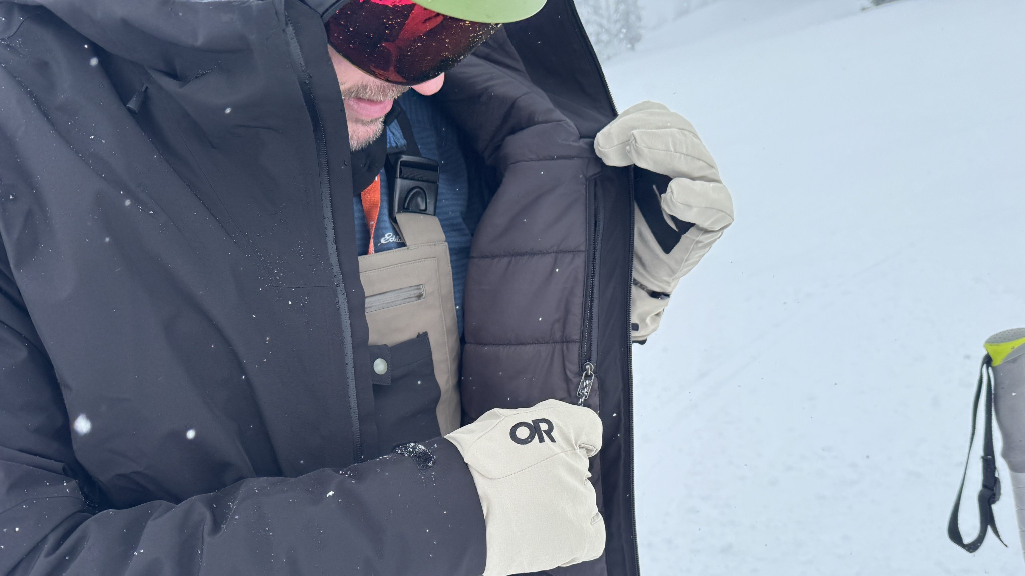 As for the fit, the Patagonia Storm Shift Insulated in size XL fit our 6'3" 220-pound tester nearly perfectly, fitting as expected compared to other XL ski jackets. He reported a cut that was just a bit athletic, just a bit trim, but it had enough interior volume to let him ski comfortably in a base layer with a thick midlayer for extra warmth. Shoulder mobility was also quite good, ranking well against other insulated jackets. Most people should be able to order their usual size.