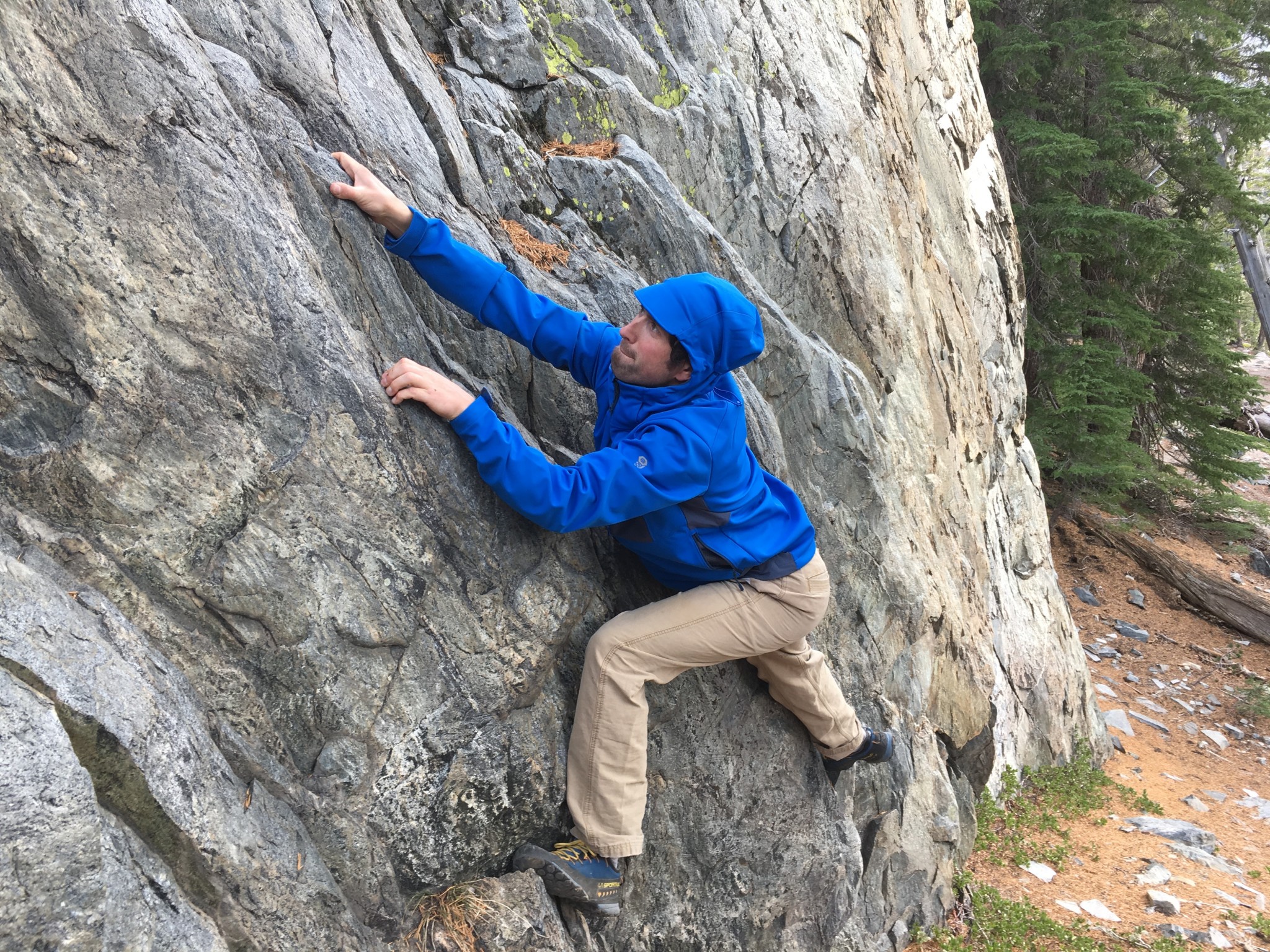 The Dragon jacket uses a fabric Mountain Hardwear calls AirShield and is a predominantly polyester blend. Also featured is a lighter, stretchier fabric called Chockstone, which has been used in high wear areas like the waist, where a climbing harness or backpack hip belt would sit. Between the ample sizing and the excellent stretch of the AirShield/Chockstone fabrics, we could move around without any noticeable restriction, despite the jacket being one of the heaviest we tested.