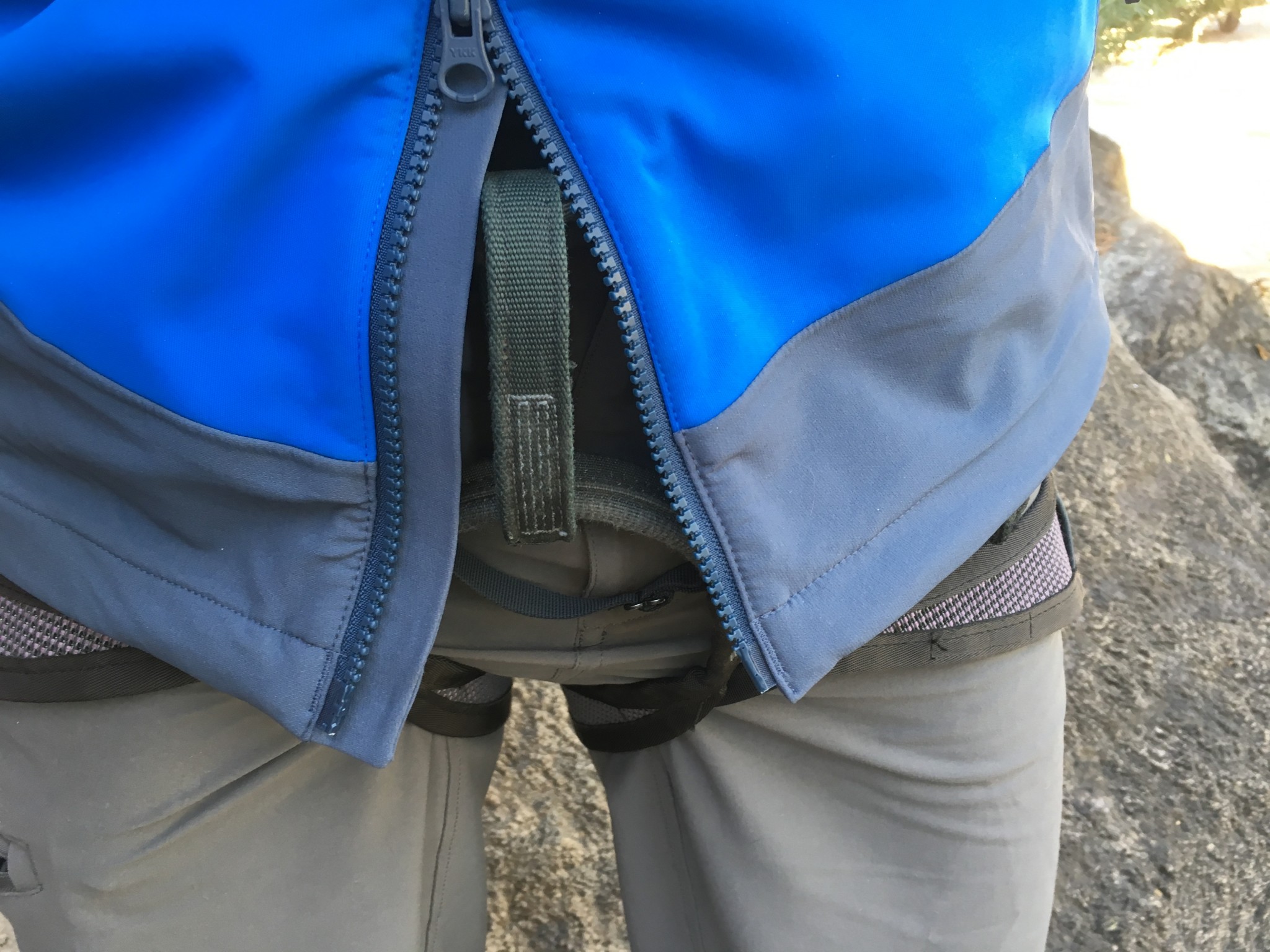 During the stretch test, we did not notice any cuff drop while grabbing above our heads. While reaching up for climbing hold or searching for an ice tool placement, we noted a 2.5-inch rise in the hem, which with the longer than average cut, still kept the jacket securely tucked under the harness, unlike shorter cut coats like the Outdoor Ascendent Hoody.