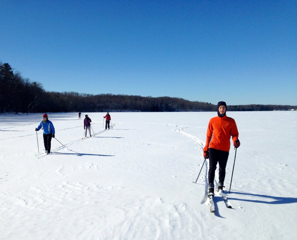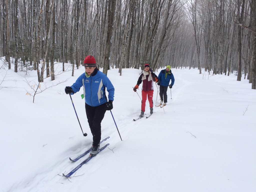 Lightweight softshells are the best type of jacket for cross-country skiing. Here Meghan, Sarah, and Dan ski in three different softshells. Pictured Rocks National Lakeshore, Michigan. Credit: Max Neale