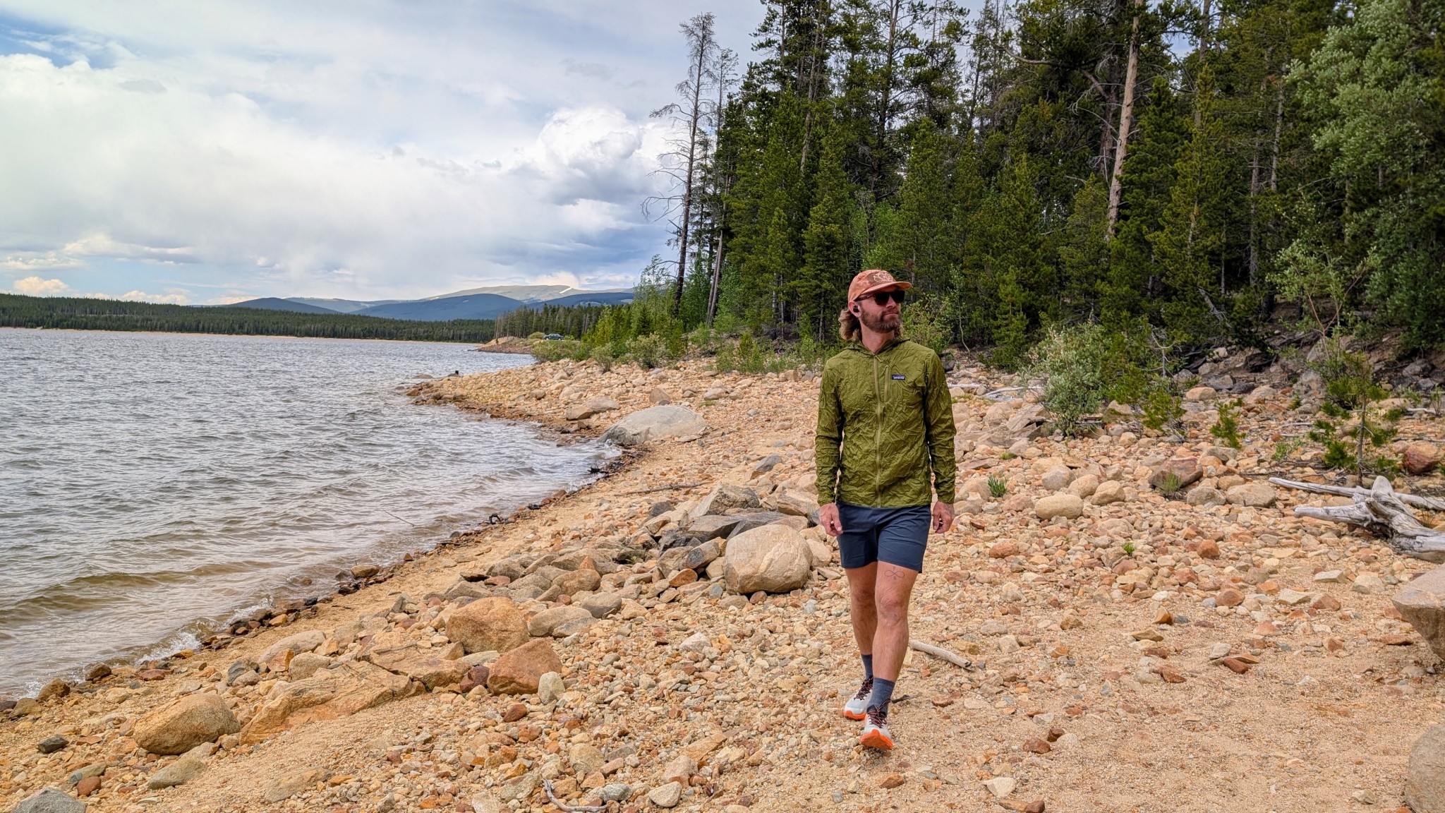 We used this jacket on a week-long backpacking trip in the Weminuche Wilderness of Colorado. During that trip, we alternated wearing this jacket and a burlier jacket with a 2.5-layer waterproof-breathable membrane. The two jackets use completely different methods to ward off the rain, but we were amazed to find that the DWR coating employed on the Houdini was just as effective as our actual rain jacket.