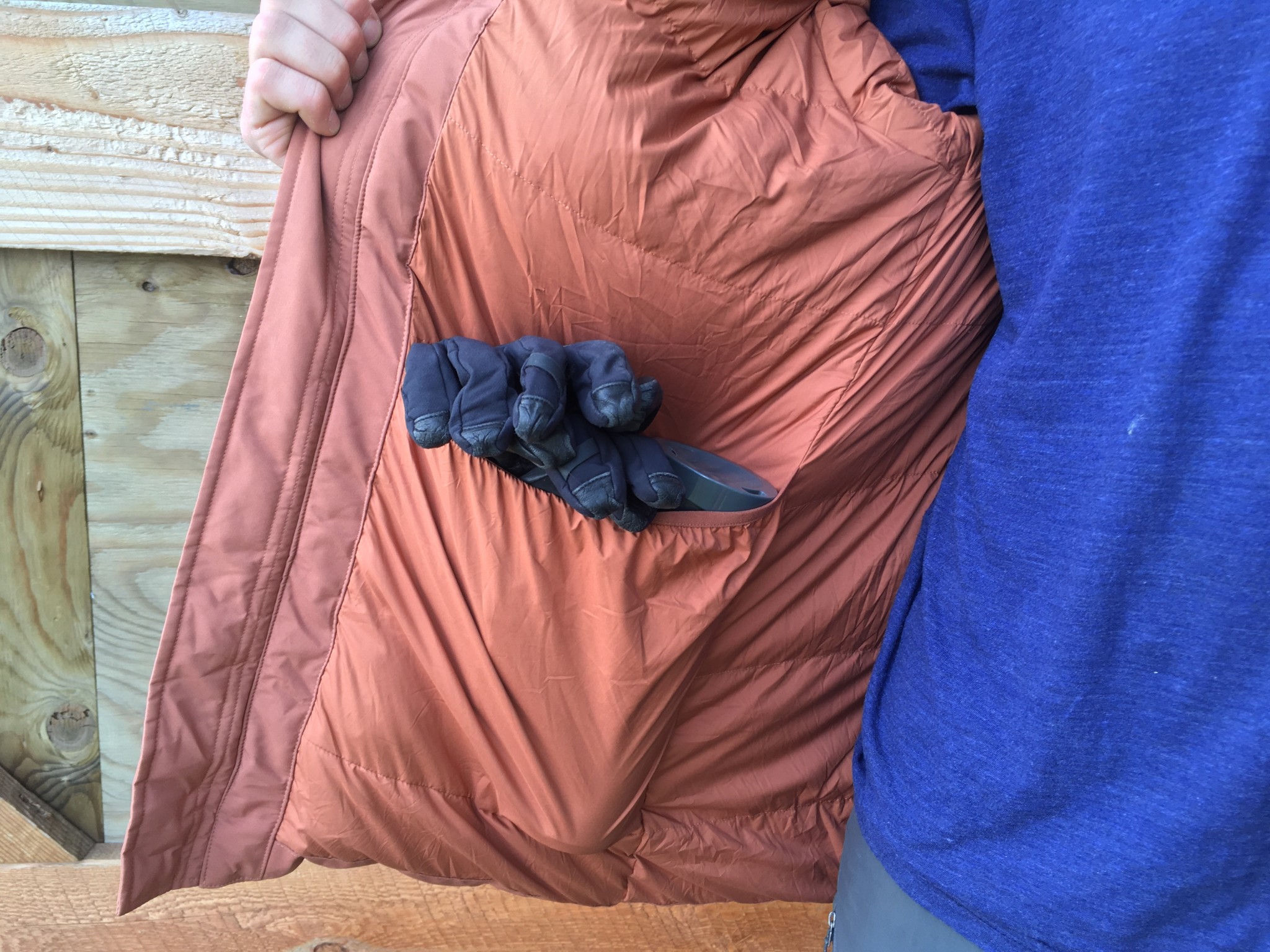 This jacket is bomber. The robust shell fabric feels tough and is resistant to catching, tearing, and staining. The interior polyester fabric is thin but doesn't come into contact with any zippers, and none of the zippers in this jacket ever caught on nearby material during our test. The hood adjustment cord is hidden underneath a durable fabric panel and won't get snagged on sharp edges.