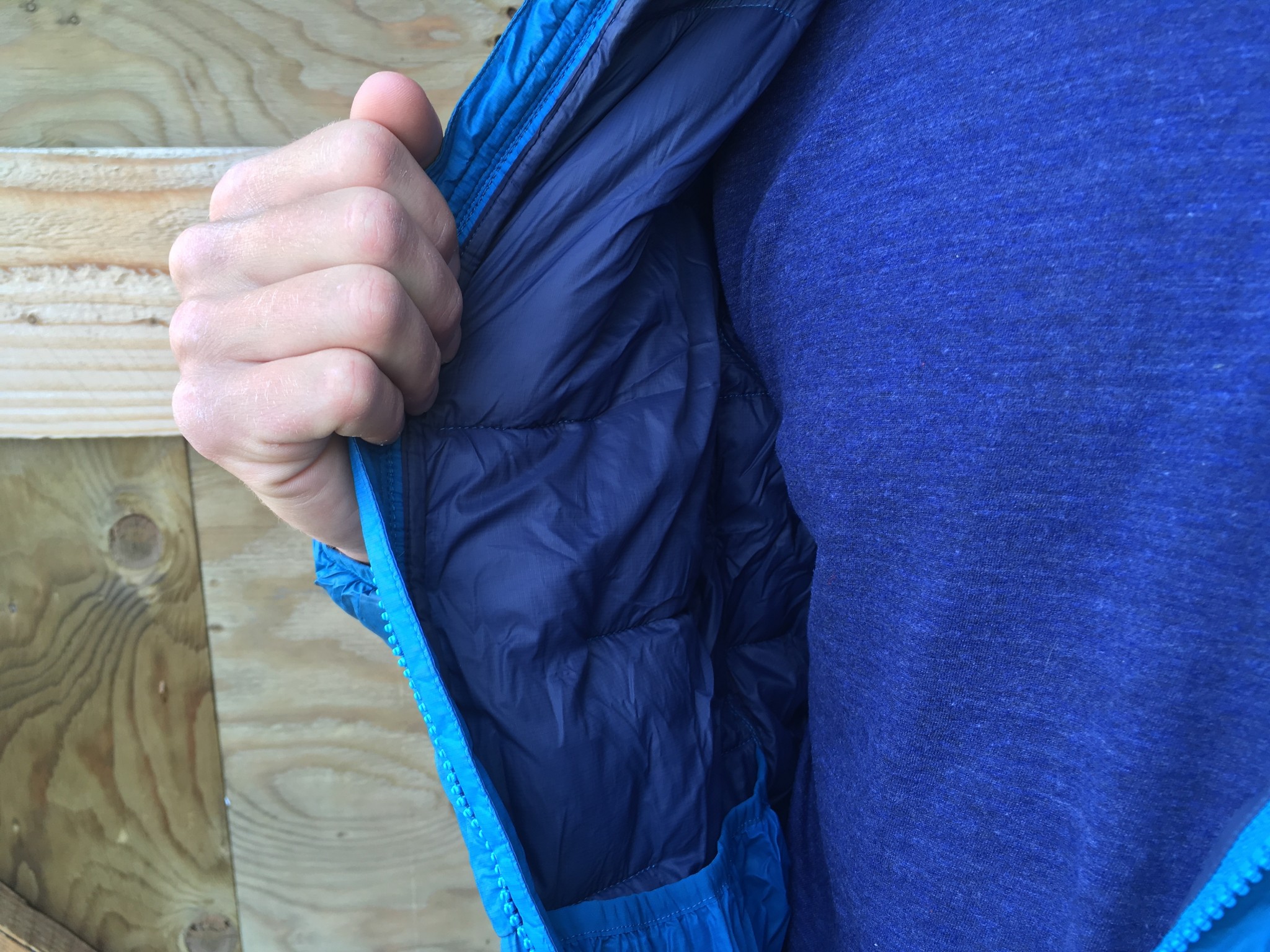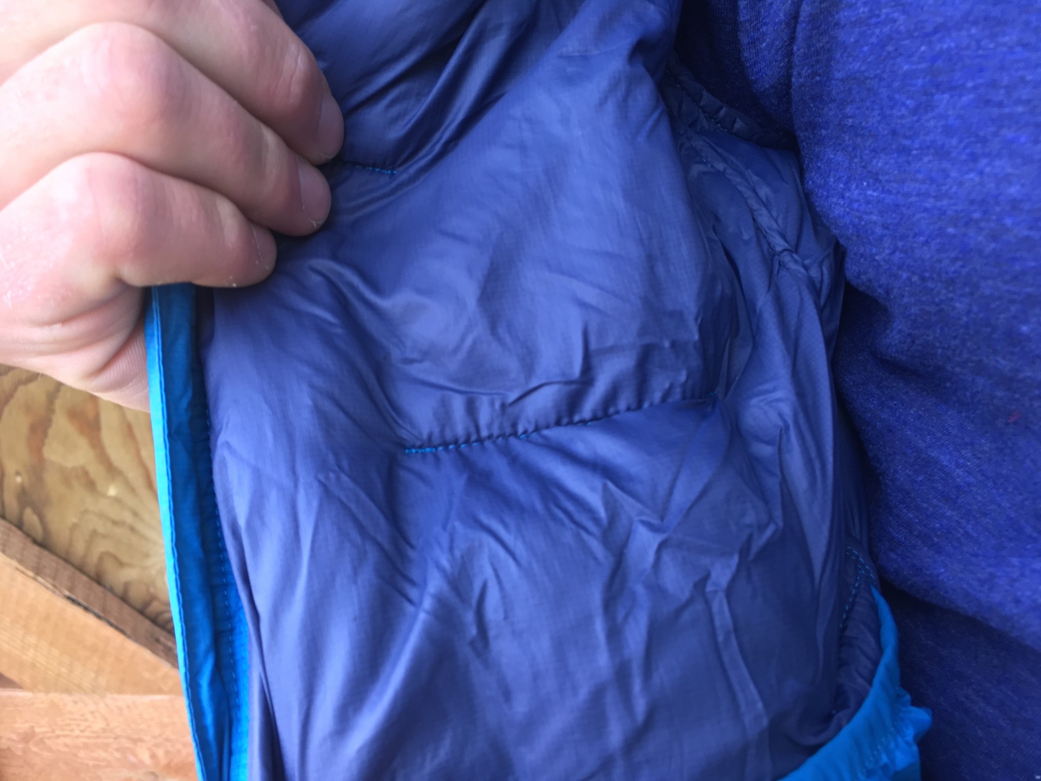 The hood feels cozy around the back of the neck, and the 10-denier nylon fabric of the jacket is soft on the skin. It avoids the crinkly and stiff feeling of the Arc'teryx Camosun Parka, and it feels very similar to the inner layer of the Patagonia Tres 3-in-1 Parka. However, the fabric can sometimes feel too much like a plastic bag, especially if you are on the move and generating heat, sweating at all, or getting wet from rain, which is a distinct possibility in this jacket.