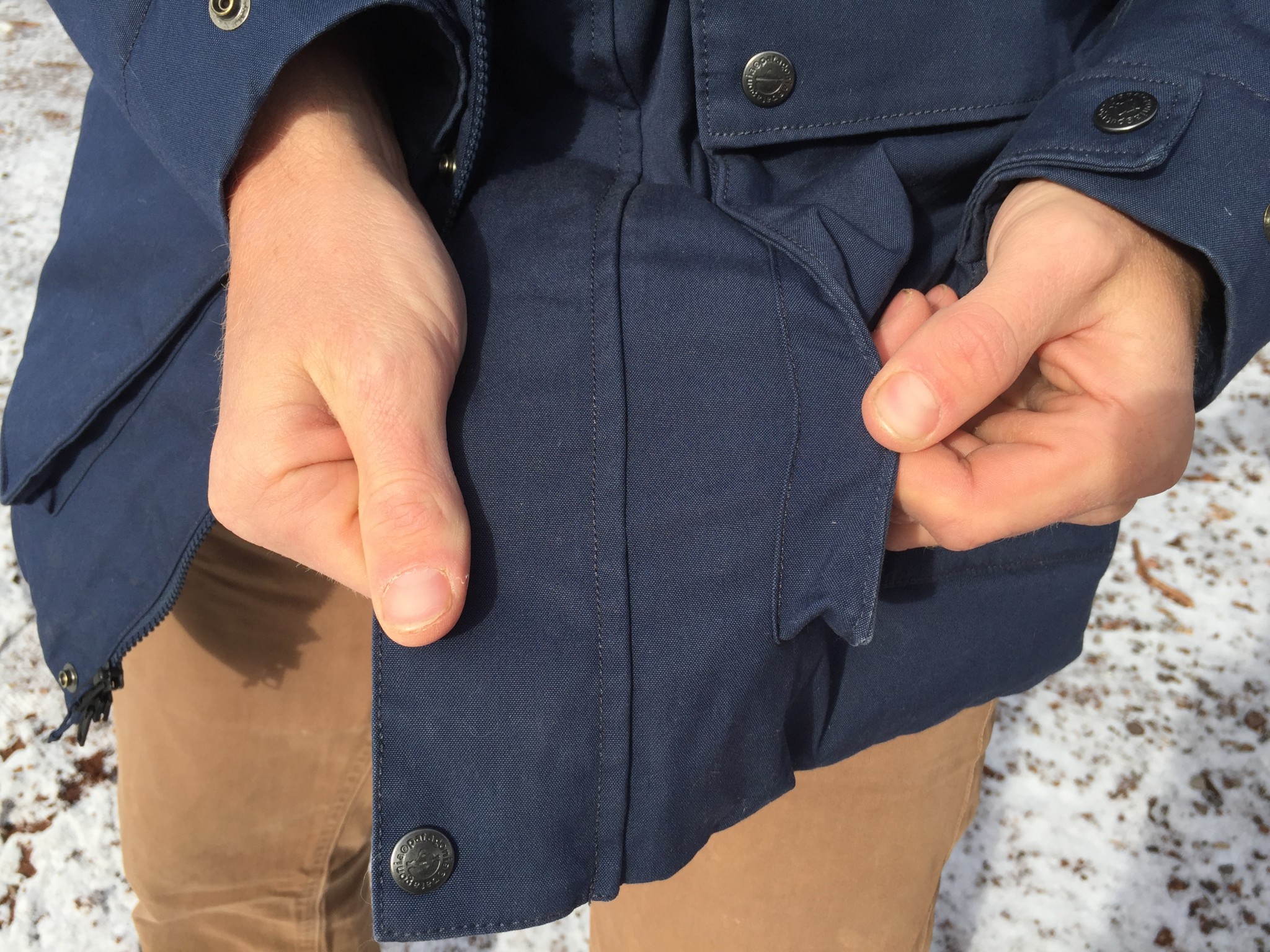 The Maple Grove Parka features two open handwarmer pockets that are located directly underneath the two large front cargo pockets, which snap closed with two buttons each. There is an external chest pocket on the left side, and an internal one on the right side, both with zipper closures. Our favorite winter parka design also includes interior stash pockets for storing gloves and other winter accessories, but the Maple Grove is still very well-featured.