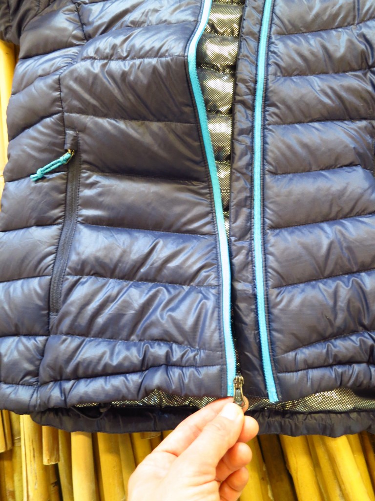 The TurboDown jacket is simple and basic. Nothing extraordinary in the features department, and a few minor flaws. The cuffs are soft elastic, very nice and simple. The hem has a nice draw cord. But the hood is not adjustable and rides high, stopping well above the forehead. It is quite snug around a helmet.