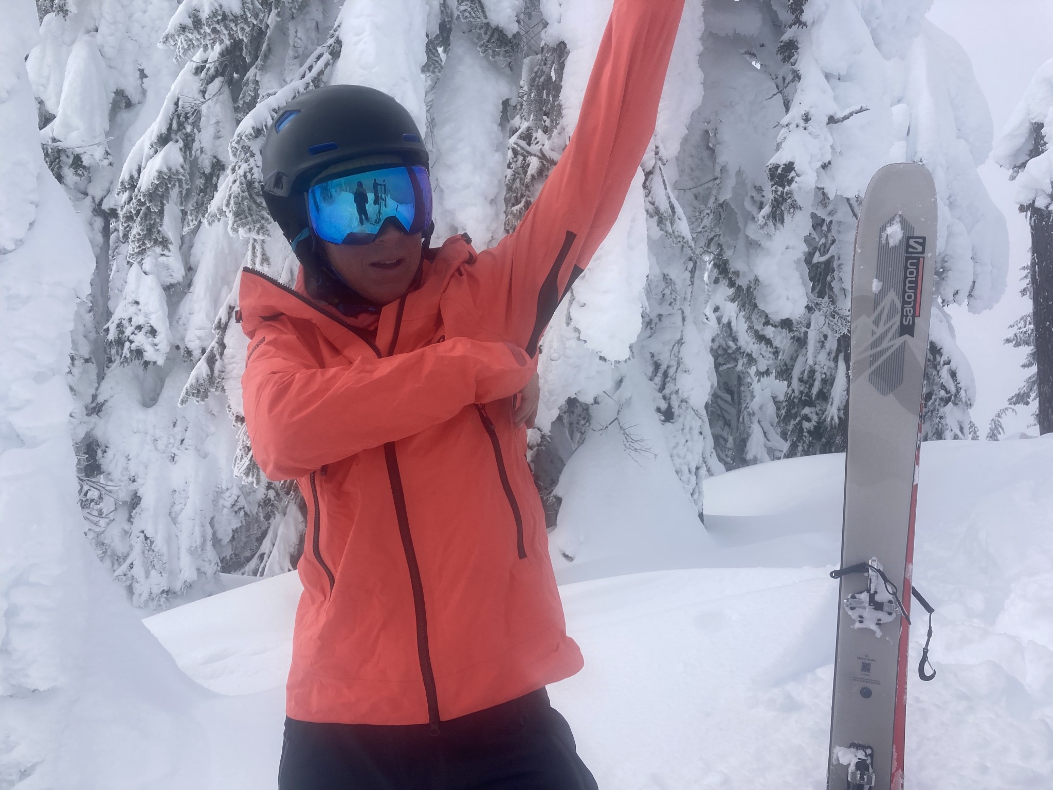 The Archangel uses top-notch waterproof/breathable Gore-Tex Pro, as burly as you can get while remaining reasonably breathable. This jacket also features pit zips to help to shed excess heat in a hurry. Typically we like this feature, but the large teeth and lack of storm flap or waterproof zippers here raised concern for the permeability of the jacket in really wet weather. Indeed, in our testing, liquid water runs right through these zippers. In frozen climates, however, where liquid precip is not a thing, this permeability may be a boon to the underarm ventilation, even when not unzipped!