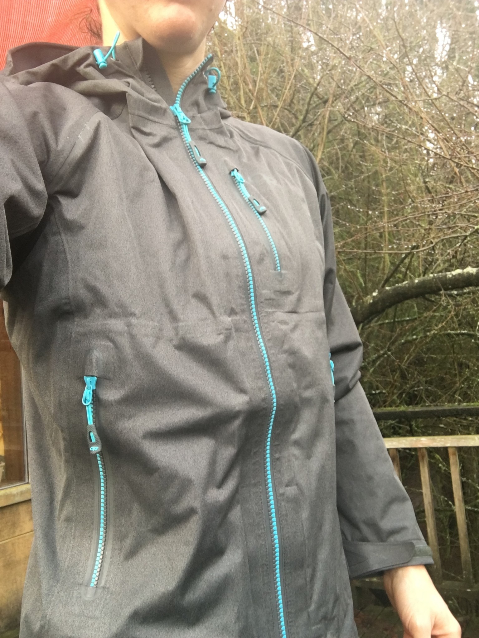 The hood has the standard three adjustment points, and an excellent brim with trim that cinches around the face. The cuffs are simple velcro, and the waist features a single drawcord adjustment point which is simple and saves a little weight, which we liked.