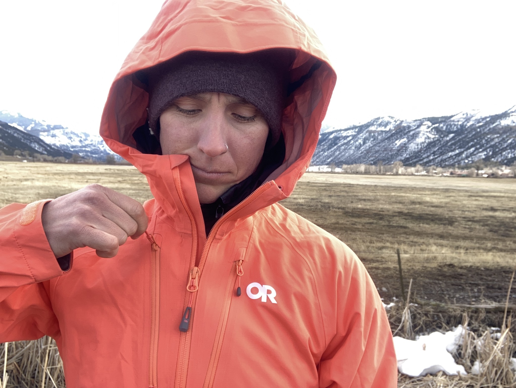 Although many of the features on this jacket are very well thought-out, some missed the mark. We appreciated the hand pockets with storm flaps and the waterproof main zipper, also with a storm flap, which ensure this jacket is well suited to rainy environments, exactly as advertised. However, the hood, which is adjustable, feels a bit snug when worn with a helmet, limiting its range of uses to less technical endeavors that don't require much helmet-wearing. The chest pockets are very high, and we found them difficult to use–even more so when we tried wearing a helmet and then accessing them with the jacket zipped up.