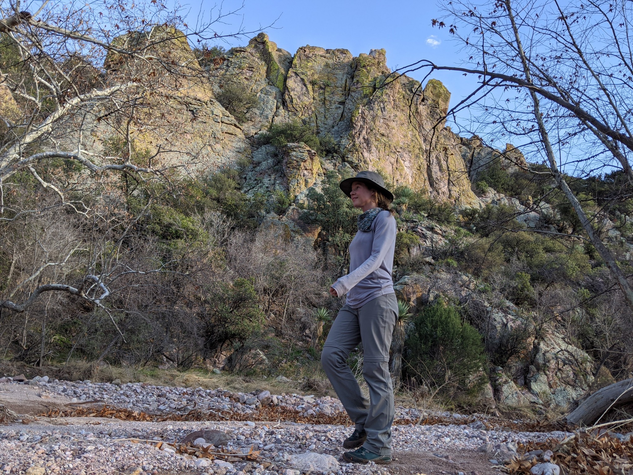These pants also offer UPF 50+ protection, which we truly appreciate in the intense desert sun. When it comes to wind, this 90D nylon provides some resistance, but it also allows cooling breezes to penetrate. If you run cold or are heading into cold climes, it's easy to fit a base layer underneath these stretchy pants without feeling too restricted.