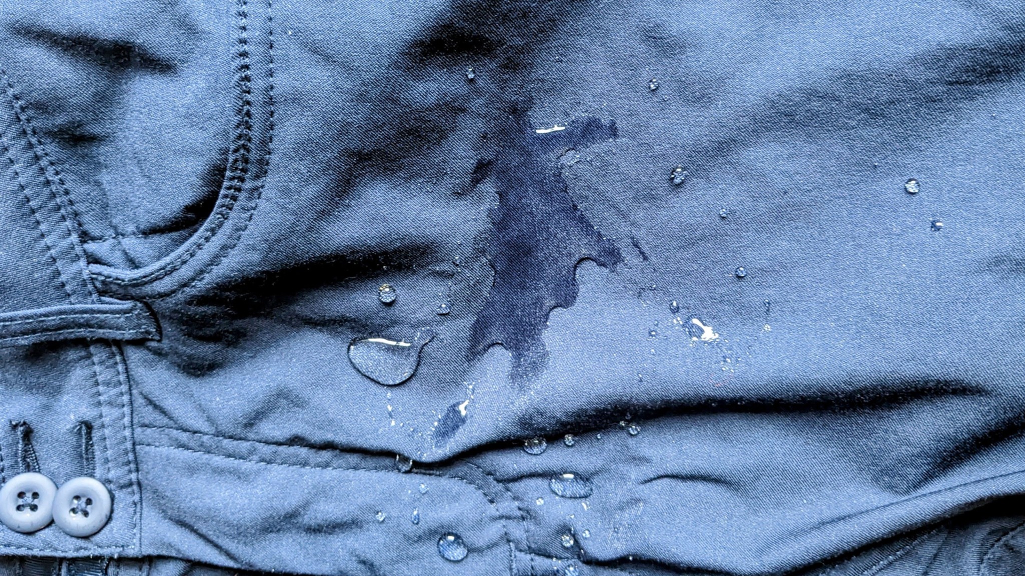 These pants have a durable water-repellent (DWR) coating that beads light splashes or rainfall, helping the water evaporate more quickly or simply roll off the fabric. We put the Halle through several water resistance tests, some intentional and some accidental. We sprayed the pants with a water bottle, stood in the shower for a few minutes, and got caught out in a storm when the rain was coming in sideways. The pants can shrug off light splashes, but when it rains, the DWR sheds water for a moment before it starts to soak the outer layers and reach your legs.