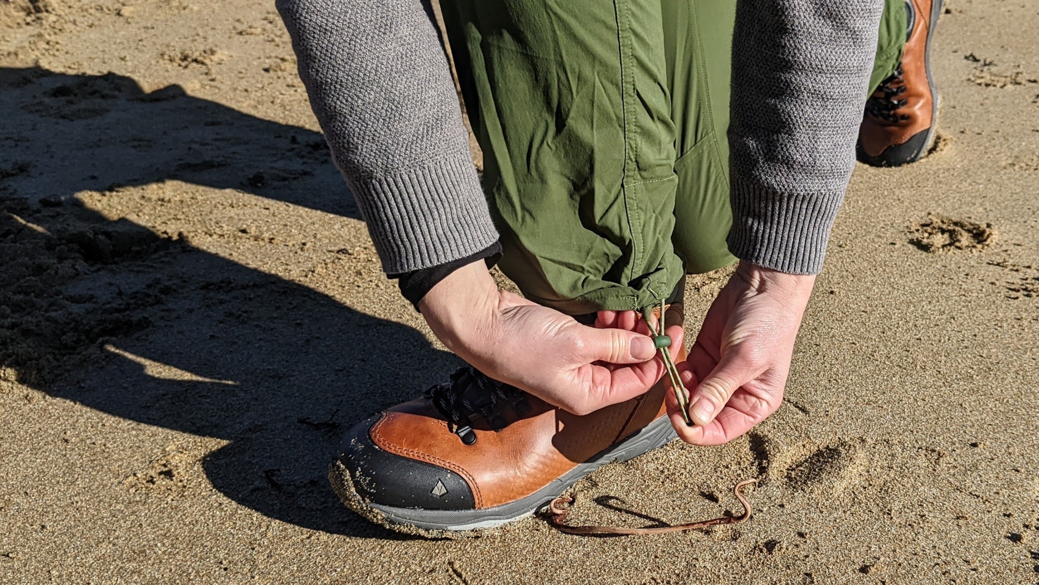 From high stepping up steep trails around Acadia to awkward climbing moves or pigeon pose, we never feel restricted when wearing these pants. A cinch that lets you tuck the hems out of the way when it's raining or you need to watch your footwork work doesn't hurt.