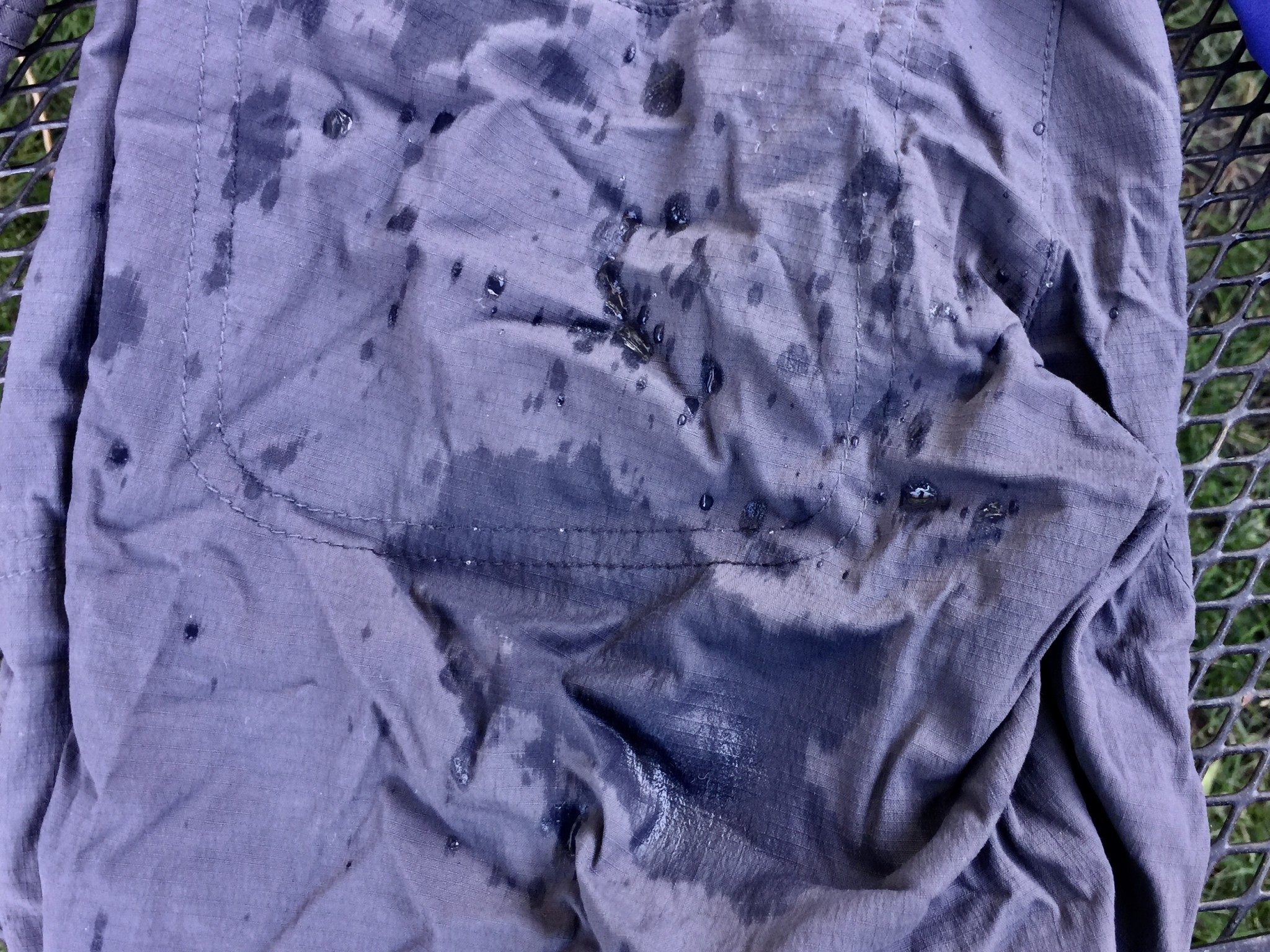 According to the manufacturer's description, the fabric also has a DWR (durable water repellant) treatment. During our testing, however, we were unable to determine exactly how the DWR treatment plays a role in water resistance. The pair absorbs water instantly and does not classically bead as the other repellant shorts do.