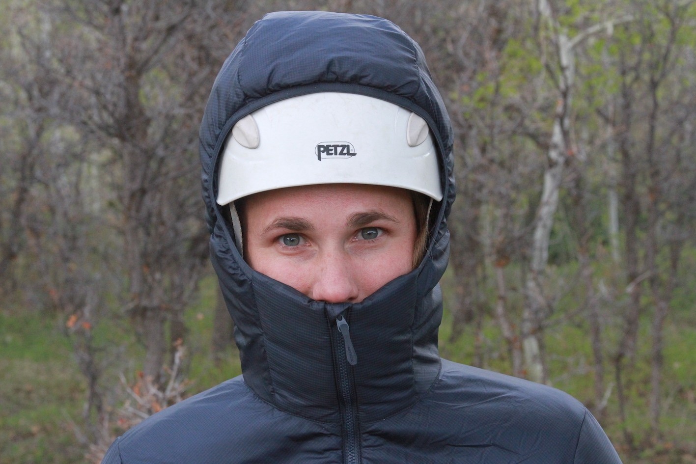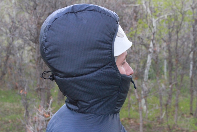The hood on this jacket easily fits over a helmet, and completely covers your face — up to your nose, balaclava style. The pull on the hood makes for a specific fit in all the right places. The garaged zipper keeps the metal off your face, while the voluminous fit around the neck allows for layering a buff or neck warmer. You can also nuzzle in without a problem.