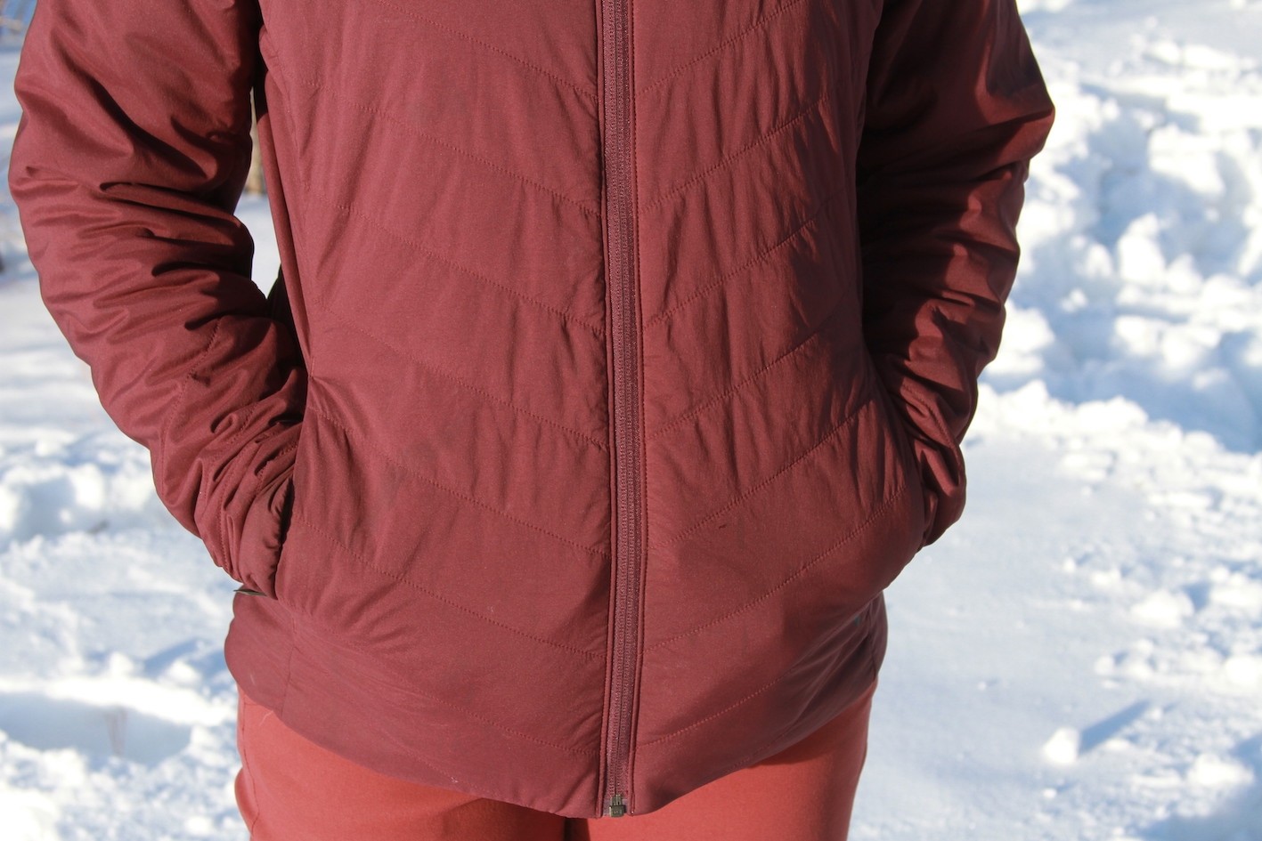 The hidden chest pocket inside the jacket offers additional storage, large enough to easily fit a phone and a snack. The elasticized hem, cuffs, and hood are also well-fitted, with the hood having a cinch cord to make for a specific fit around a helmet or hat. Overall, this jacket is quite cozy and comfortable. Wear it all day long and put larger layers underneath it if you need it.