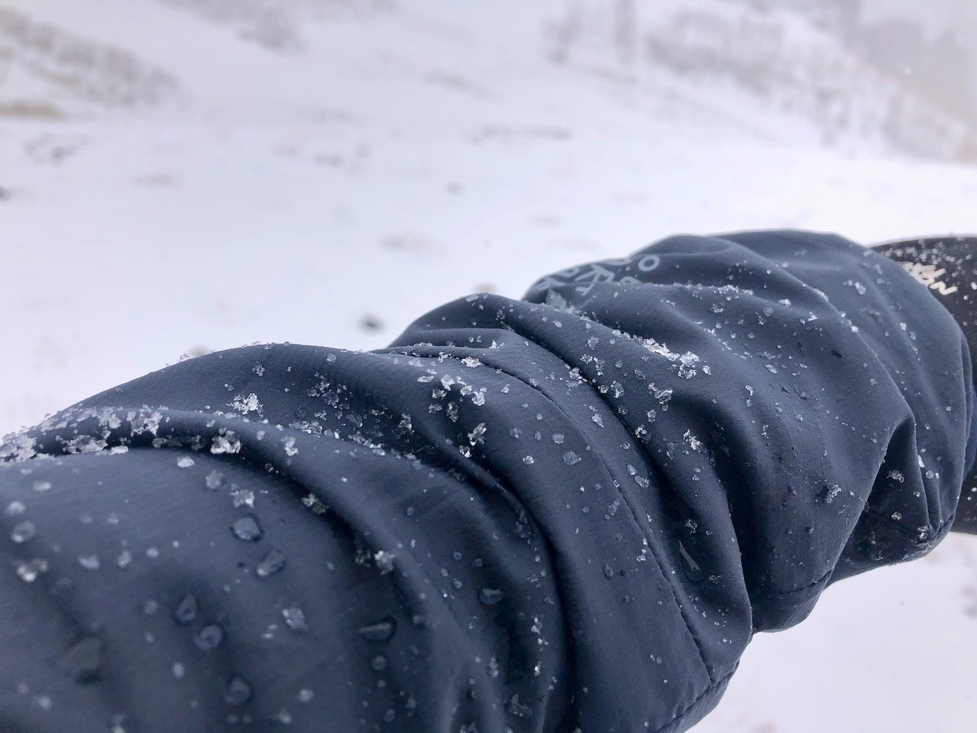 In the snowstorm we encountered, we wore a base layer and fleece underneath. The snow fell on the jacket, beading up, eventually soaking into the fabrics. After being in the storm for over twenty minutes, the fabrics were wet, but the interior of the jacket stayed dry.