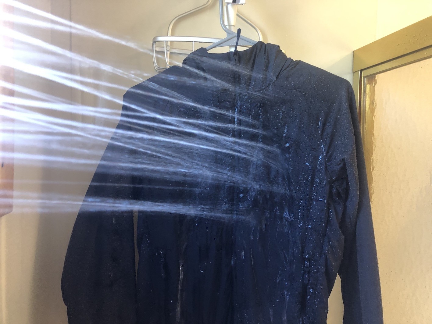 We made this same observation during our shower tests. While the jackets repelled water for a moment, it then completely absorbed. All the water pooled between the exterior and interior fabrics. This substantial amount of pooling means it doesn't have excellent drainage (while other competitors do). The interior of the jacket was still dry, but the pockets were wet with water.