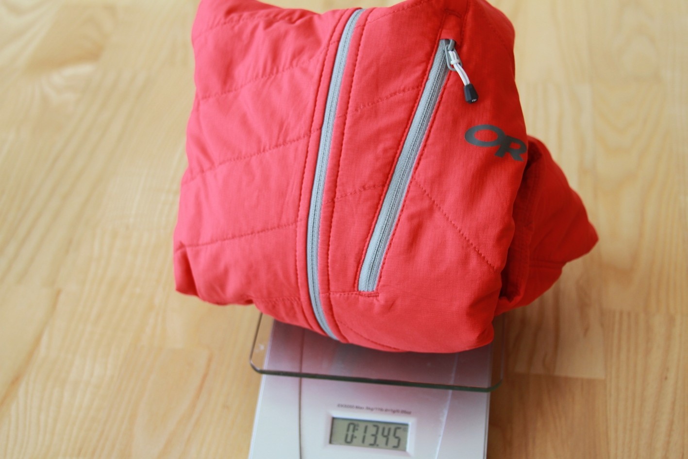 On the scale, this jacket weighs in at 13.45 ounces, which is just under one pound. Given its lightweight nature, it feels “airy” when you're wearing it and doesn't feel bulky or heavy when layered over a fleece or under a shell or heavier jacket.