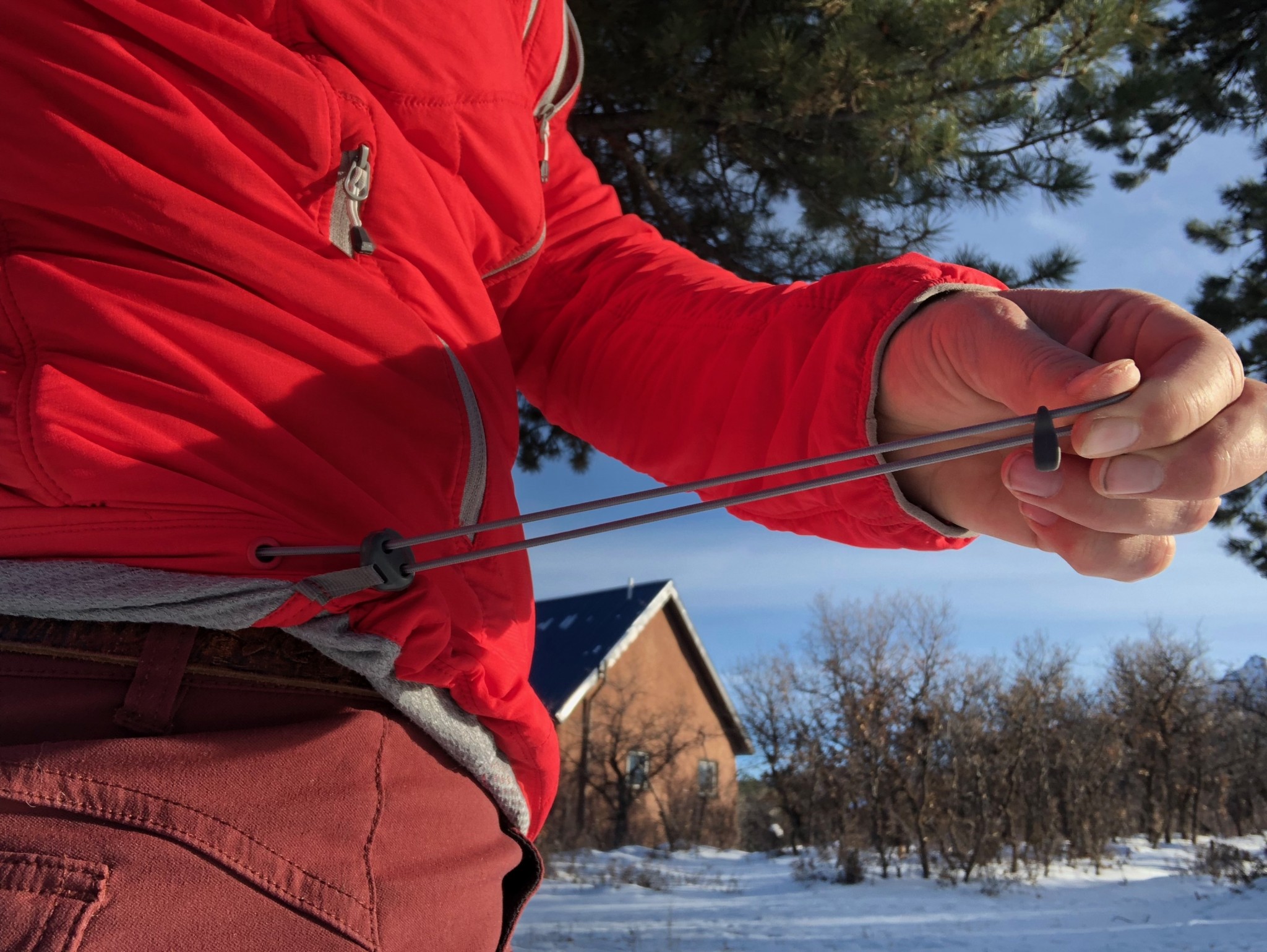 The single hem-string pull allows us to manipulate ventilation. By pulling it, you can attempt to keep warmth inside the jacket or keep it lose to let the heat seep out on its own. We also like the hood. It's fitted, but unfortunately doesn't have much room for a helmet or have any area for adjustments — so no pull strings on the back or around the hood lining.