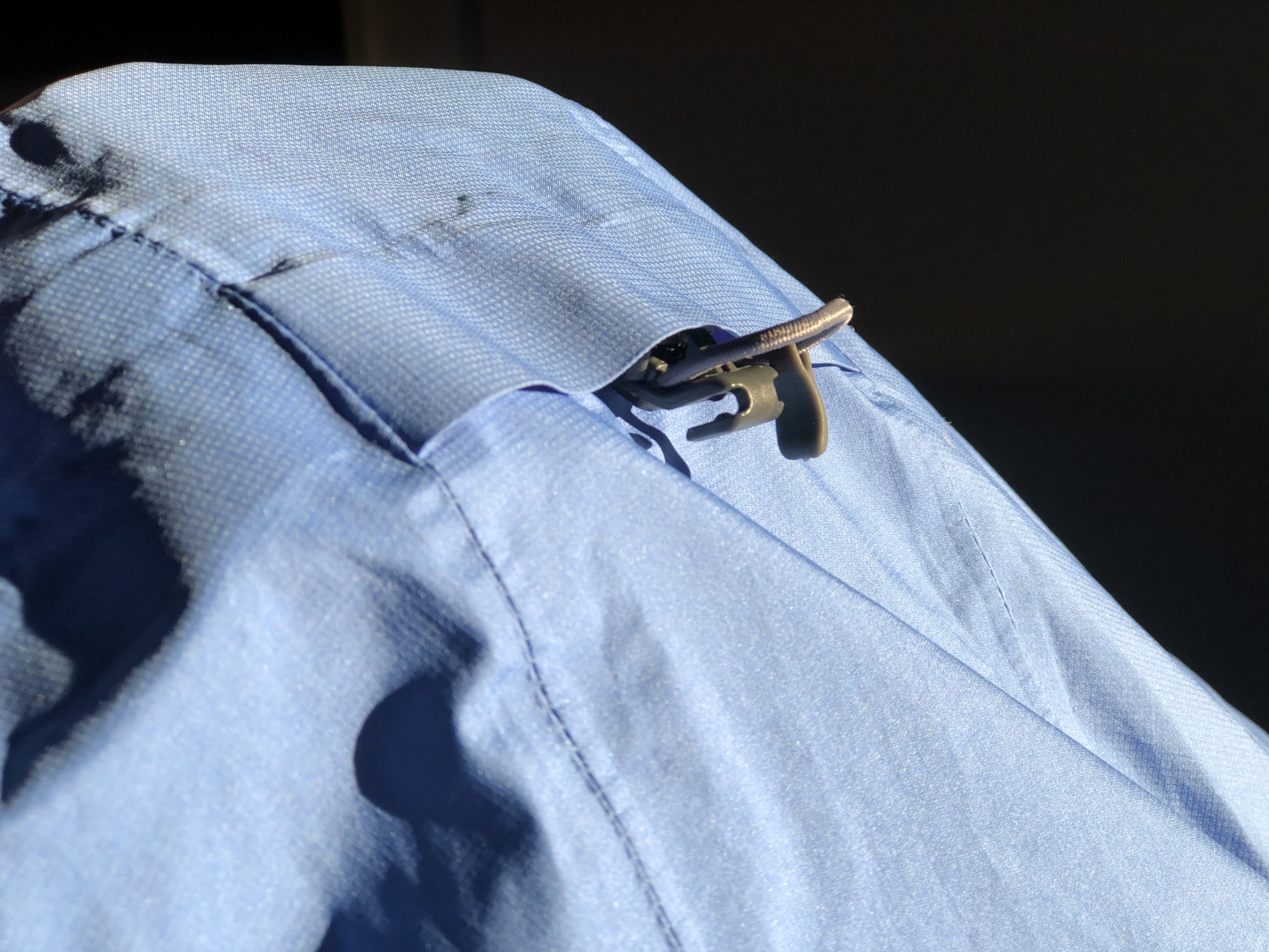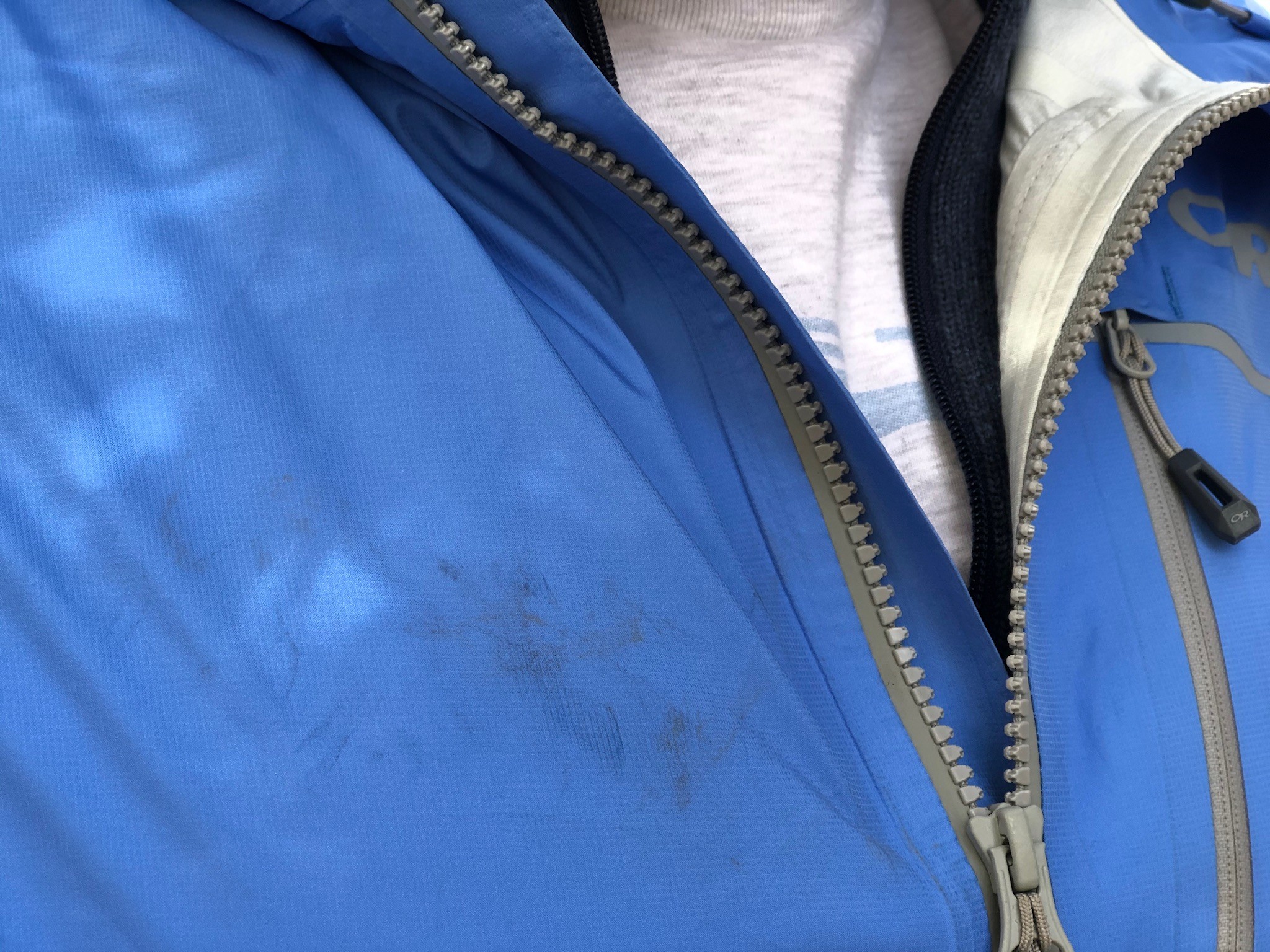 The Interstellar's 20D mechanical stretch ripstop face fabric is soft, flexible, and rather thin. Although we did not encounter any rips or tears throughout the testing process, we are not convinced of the longevity of the delicate nature of the fabric. And while the moderate stretch of this jacket makes it easier to wear, it does mean the DWR finish needs to be reapplied all the more often as it wears out quickly. We also tested the latest version of this jacket in a light, powdery blue, which unfortunately stains all too easily.