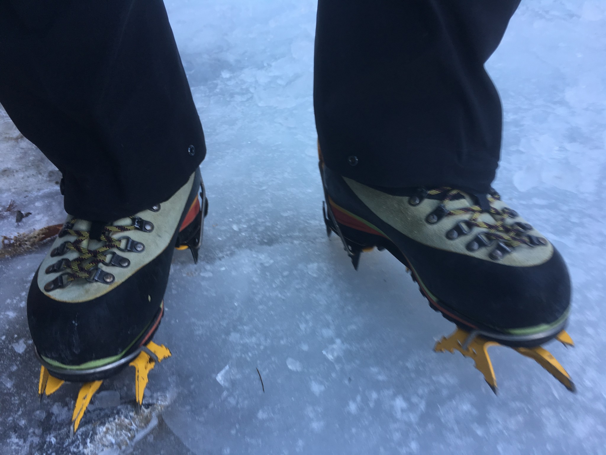 There is a shoelace hook to keep these pants secured around your boots, a cinching elastic cord at the cuff to seal out the elements, and a crampon patch made of sturdier fabric where you're most likely to kick yourself or snag your pants (inner ankles), but also great for when you're wearing ski boots and you bump your plastic boots together (more fragile fabrics don't do so well in this scenario).