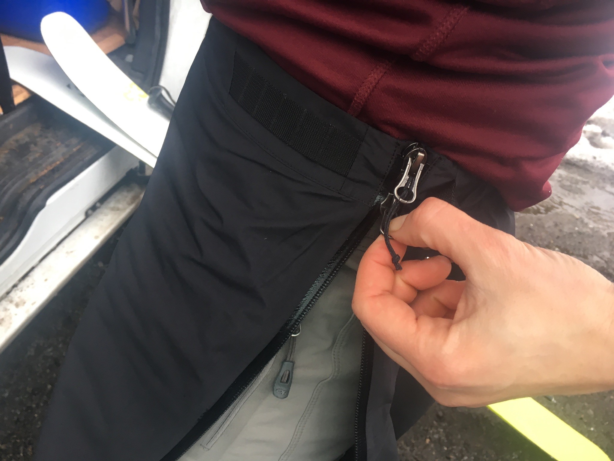 These full-length zippers allow you to don the pants when wearing crampons or skis because you don't have to put your foot through the legs to put them on. Additionally, you can wrangle the pants on under a harness, or take them off when wearing one, which is very freeing. The pitfall of this design is in the waist closure system. The hook and loop can be finicky, sometimes coming unhooked, and it is difficult to maneuver with gloves on.