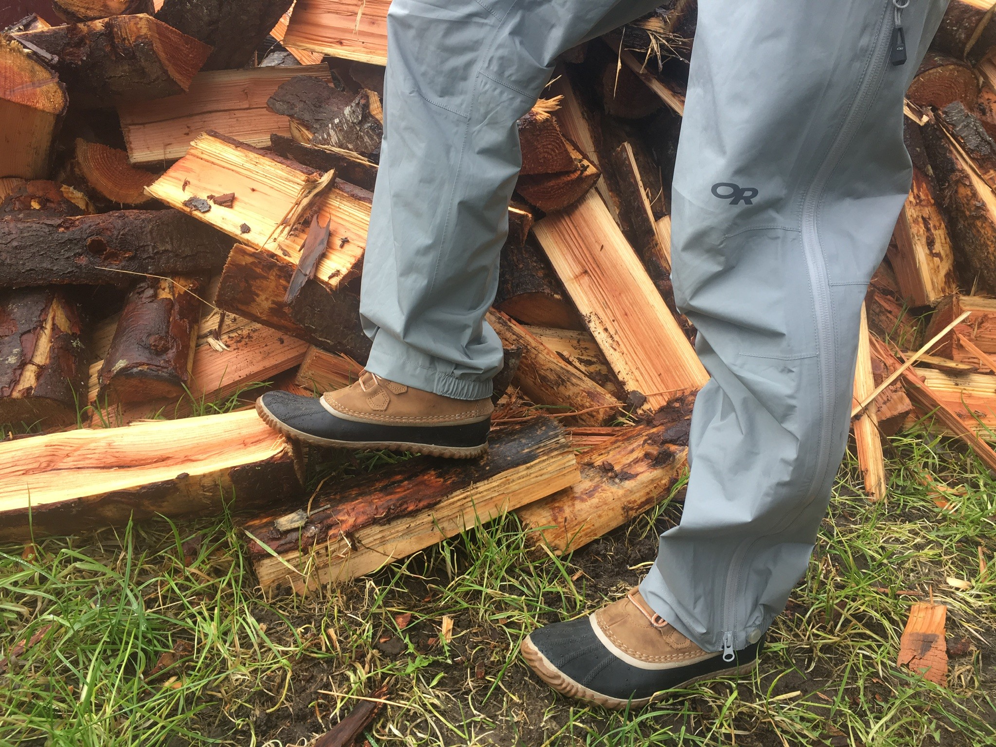 The ability of rain pants to keep water off your legs is paramount to any good rain pants. The materials are consistently good in this category—they do the job. But there are other ways that pants can fail to keep water out. The OR Aspire pants had the best waterproof/breathable fabric and features that improved comfort and utility without compromising that waterproof seal. They are made of Gore-Tex Paclite material that has taped seams and pores smaller than a droplet of water—it keeps water droplets out mechanically because they just can't fit through the material.