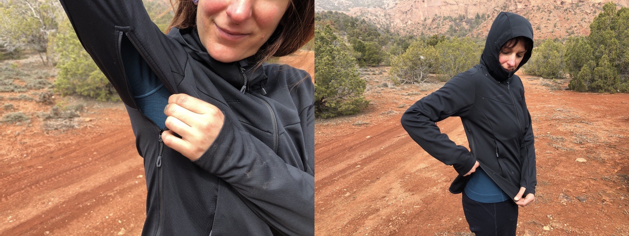 This hoody is lined and windproof, but the membrane has an open 3D structure that helps it breathe. It is cozy enough against bare skin, but if you're particularly sweaty, you will feel clammy on your arms and upper torso, without opening up the entire jacket. If you get to this point, you can vent your upper body with two-way zippers that start above the armpits and don't stop until the hem. Whether you want to vent just your pits or open up the entire torso, you can use this jacket to your advantage when modulating temperature.