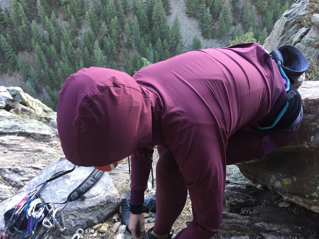 The thin nylon/spandex blend, roomy-but-not-baggy sweatshirt tailoring, and comfortable stretchy hem and cuffs all added up to a flexible easy-to-wear layer that we loved wearing (as long as it wasn't too cold outside!). We found the arms to be a good length and the hood was big enough to accommodate most helmeted heads. We also felt significant movement in the Ascendant Hoody and both Arc'teryx models, but our favorite in this category was the stretchy generous fit of the Black Diamond Dawn Patrol.