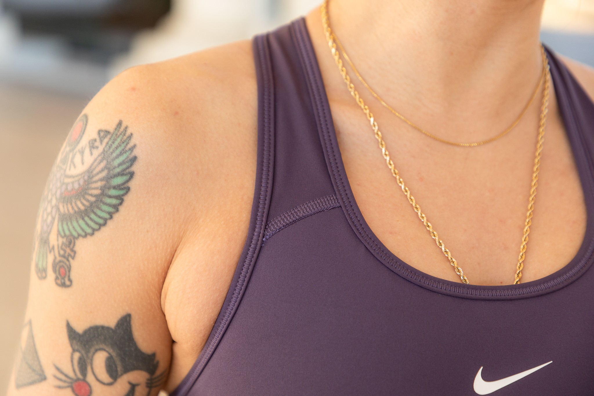 We found the compression of the Nike Swoosh comfortable and great for most medium-intensity workouts at the gym or outdoors. The waistband is firm without being constricting. Our testers found it was comfortable for mountaineering, CrossFit, and biking. The snug fit can feel confining for some women in activities with deep breathing and mobility, like yoga. While the bra generally runs small, some women choose a snugger fit for more compression. The wide waistband adds to the support and doesn't roll or lose its elasticity mid-workout. The bra fabric stays snug against the body for the most part, with a slight but comfortable, relaxed fit around the armpits. The strap bands are wide, comfortable, and don't cut into the shoulders. Women with larger chests may want a bra with more encapsulation for HIIT or running.