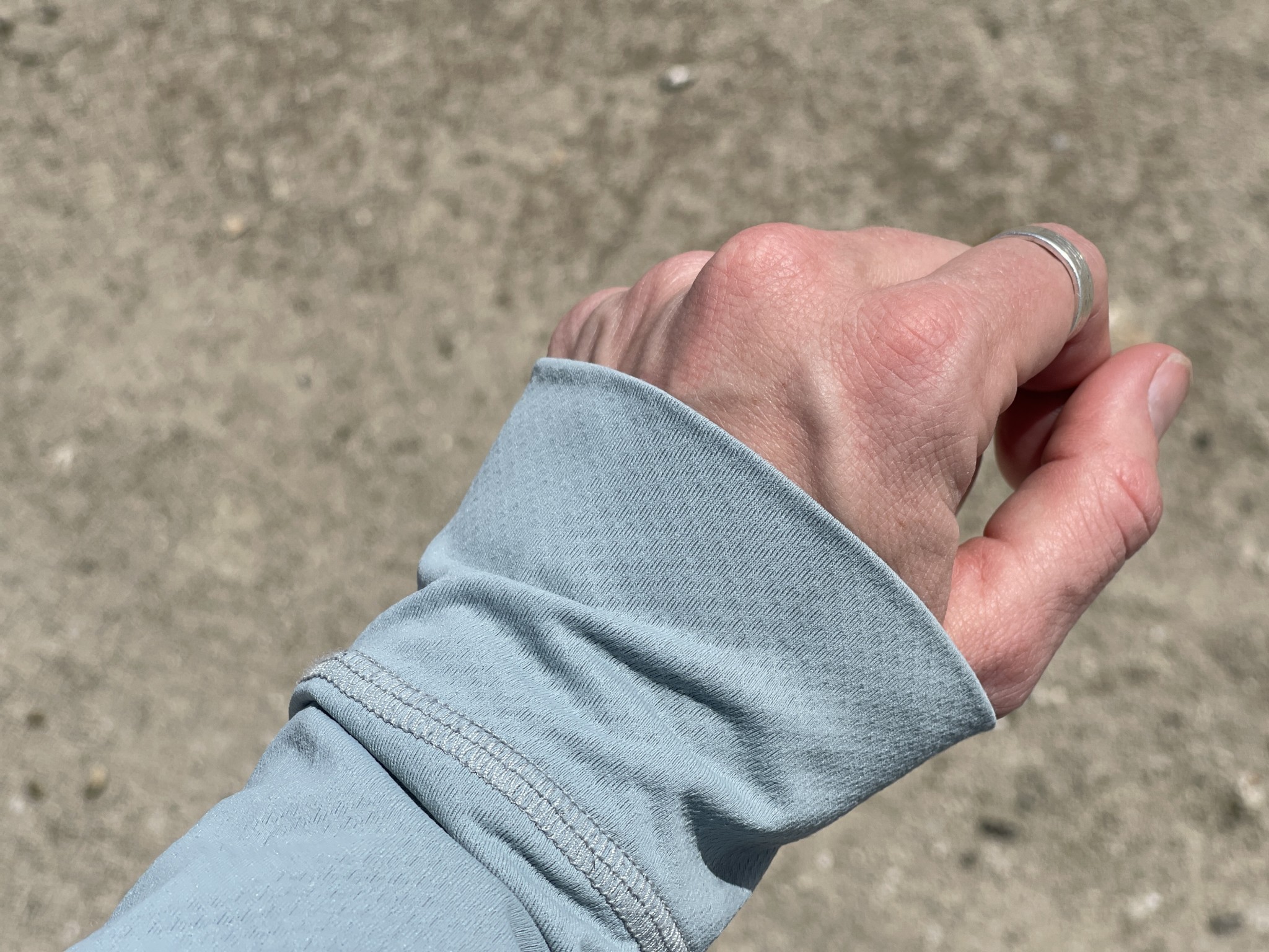 Just like most of the tops we tested, the Alpenglow has a high UPF rating of 50+. Combined with a hood that boasts a high neckline in front, this shirt offers excellent protection from the sun. The lack of thumbholes may at first seem a detriment to its protection, but the sleeves are long enough to keep a good chunk of the backs of your hands covered without the nuisance of looping your thumbs through them.