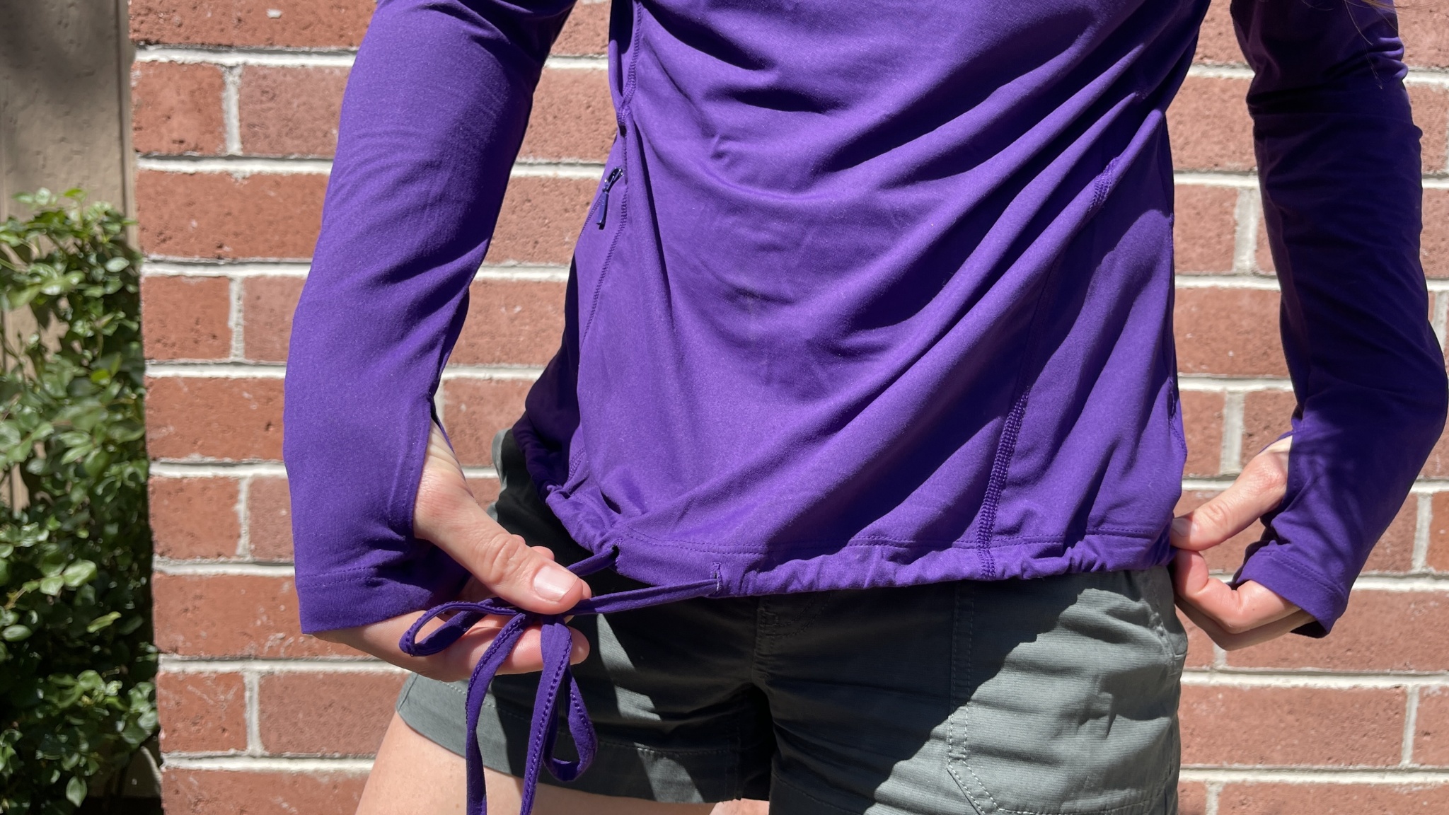We find this hoody is less flattering with the hem cinched up, but that may also be a personal preference. The cinch along the hemline certainly does come in handy when you need to be inverted and still protected — outdoor yoga or high altitude bouldering, anyone? We also appreciate how easy it is to move in this shirt — we even happily slept in it!